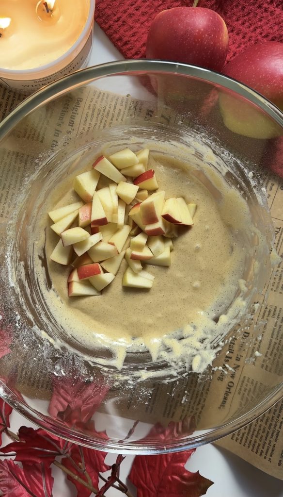 - Add Wet Ingredients: Add the eggs, milk, and oil to the dry ingredients and whisk until smooth. Fold in the chopped apples carefully to distribute them evenly throughout the batter.