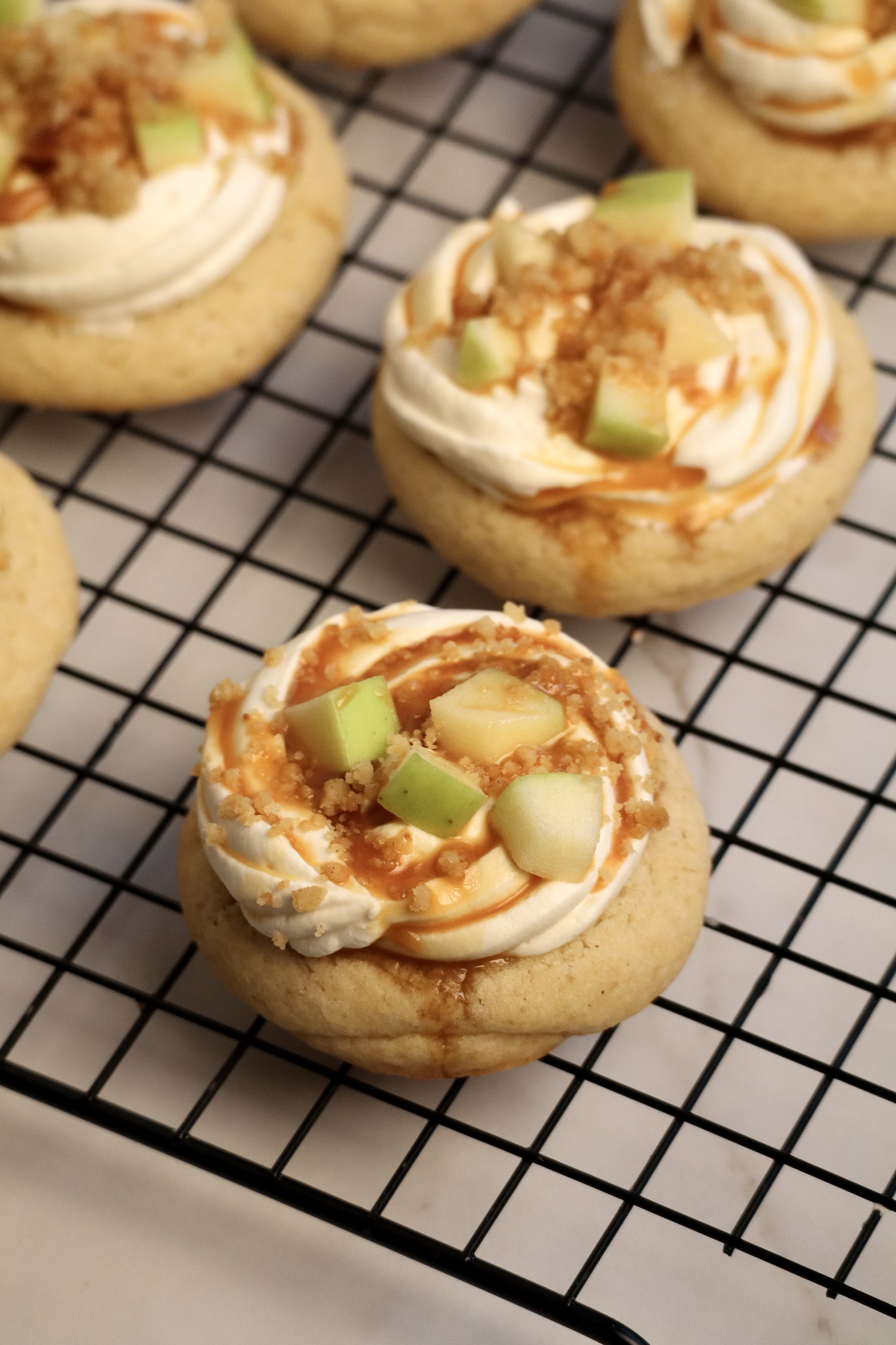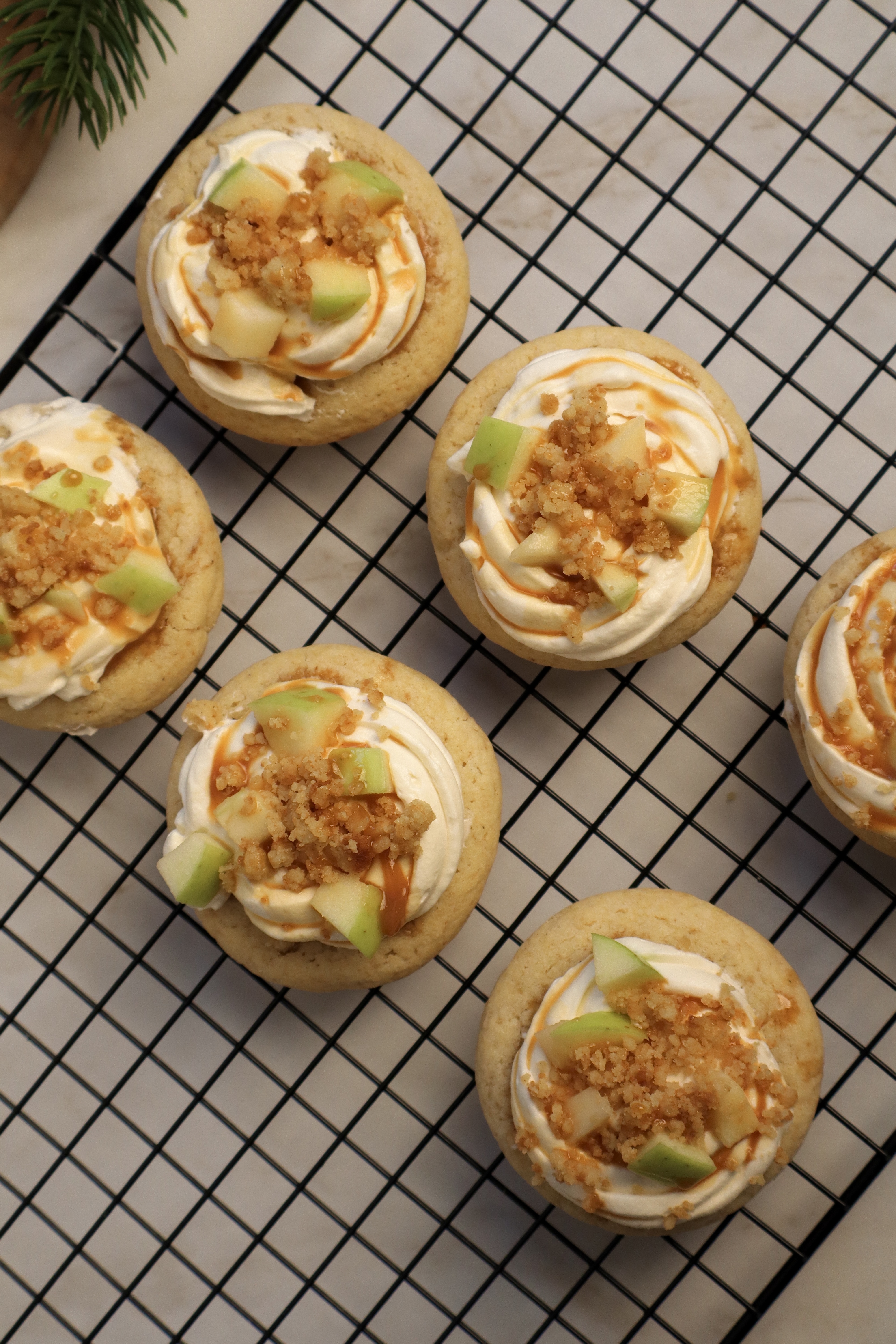 - Top each frosted cookie with a sprinkle of the cooled streusel and a handful of diced green apple chunks. The tartness of the apple provides a refreshing contrast to the sweet and spiced flavors.