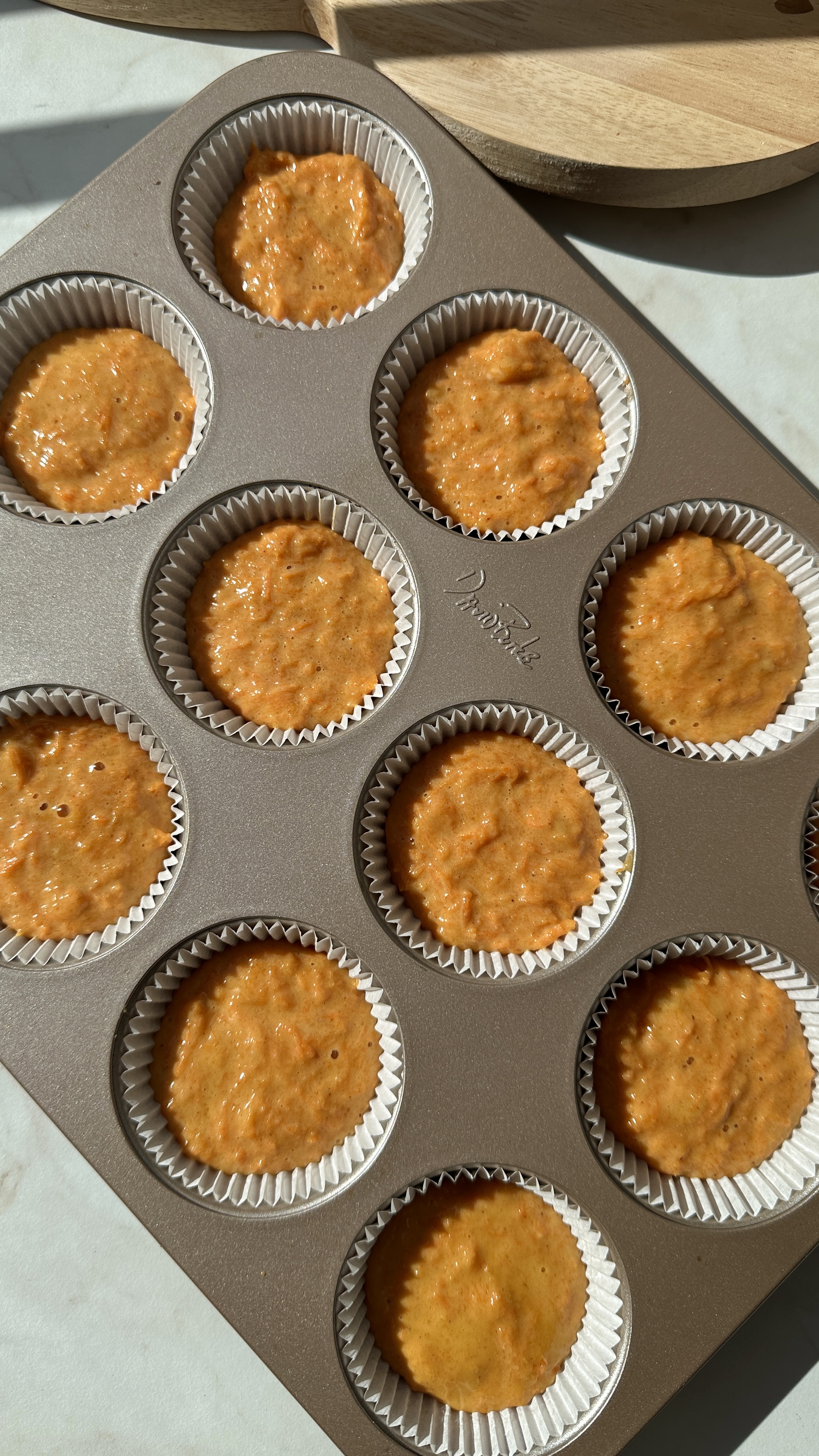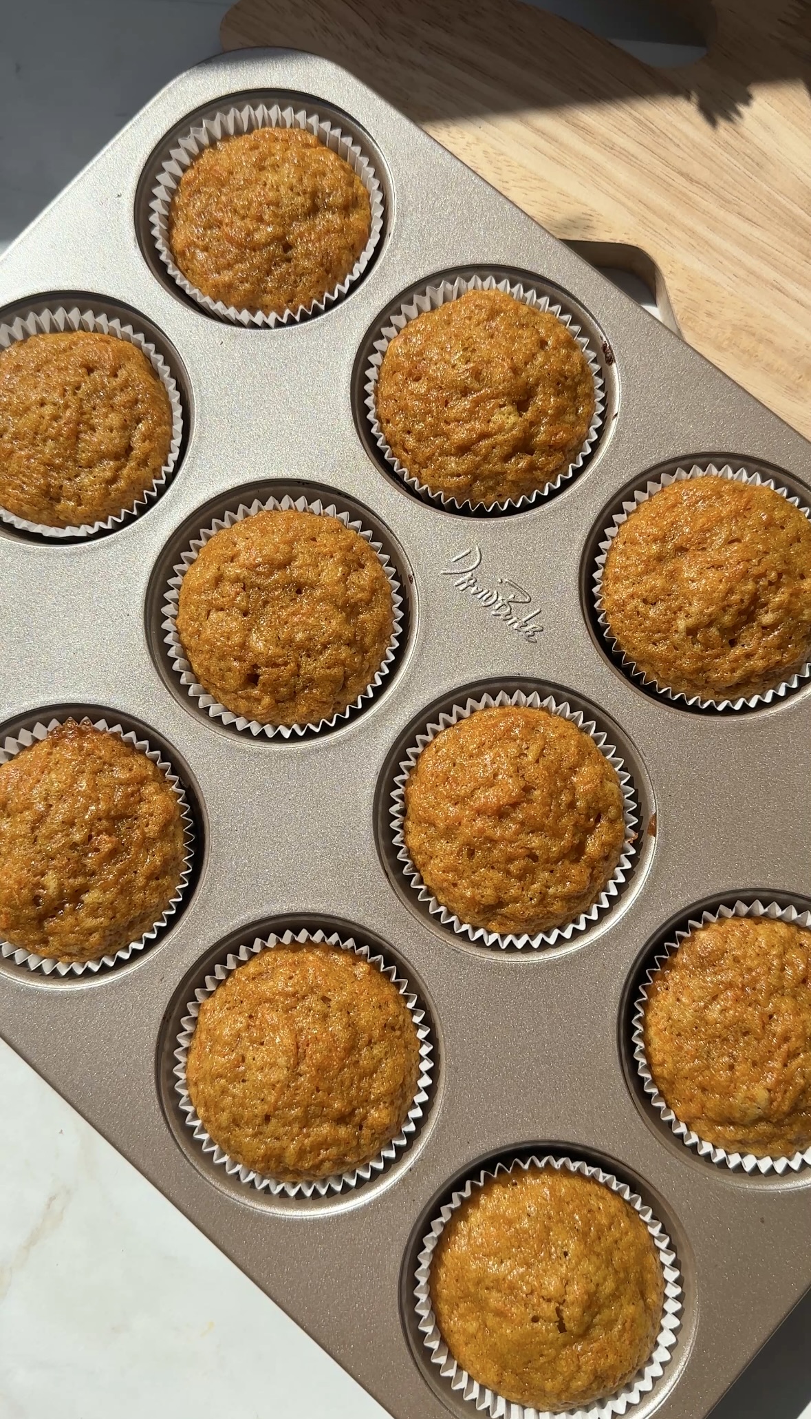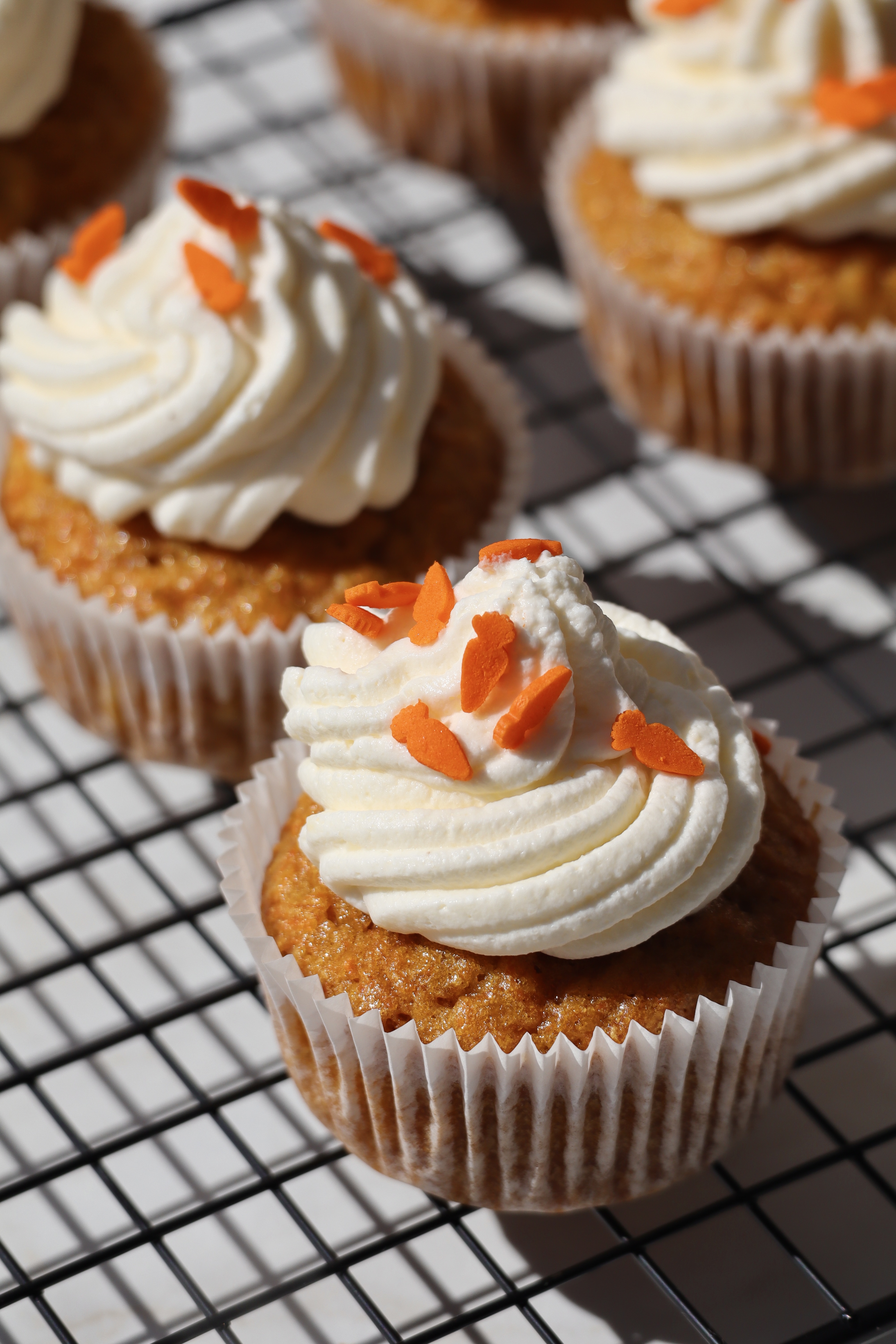 • Grated Carrots – The star ingredient! Adds natural sweetness, moisture, and texture to the cupcakes.