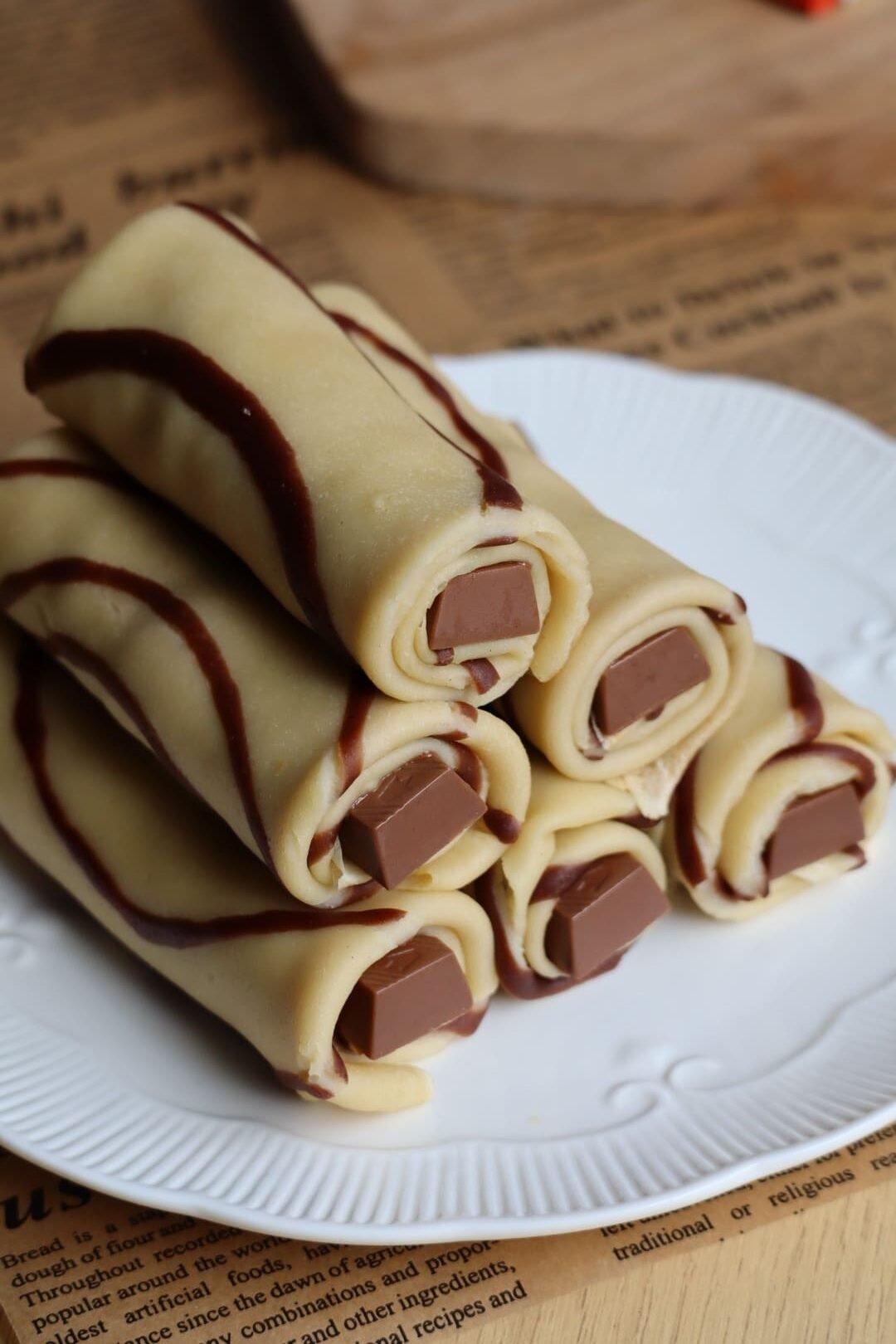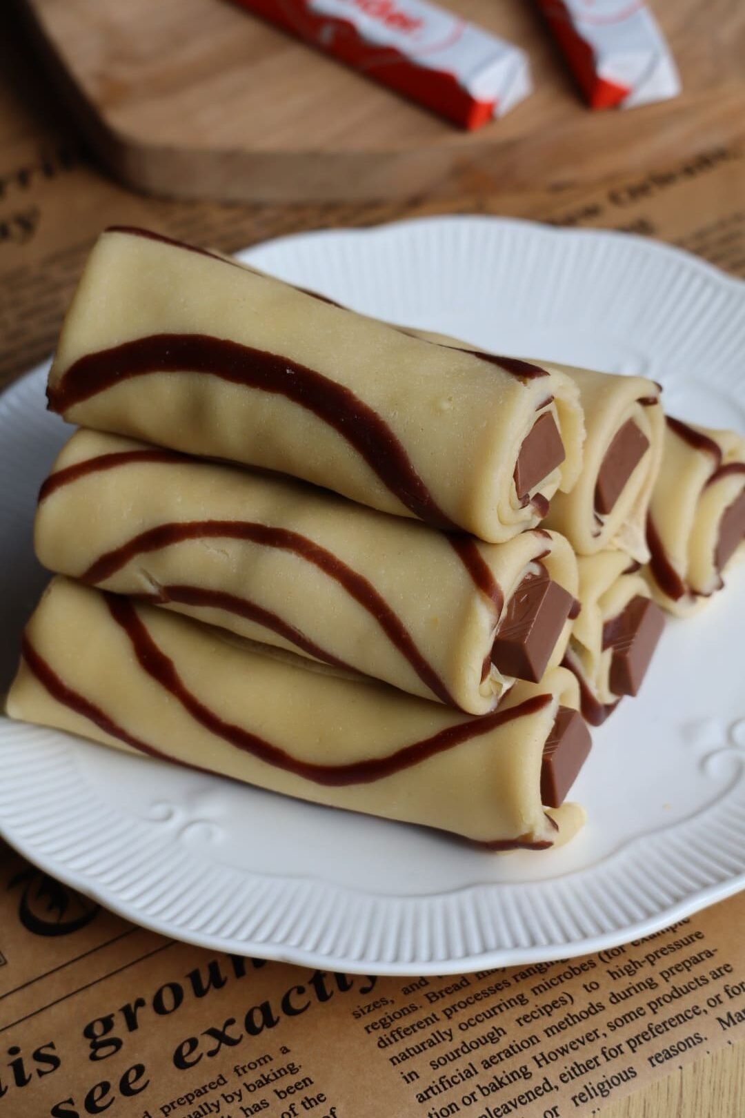 This version keeps the classic crêpe structure intact while adding a warm, chocolate-filled center. The cocoa swirl complements the Kinder filling without overpowering it, and the thin crêpes stay flexible enough to roll cleanly around the chocolate bar.