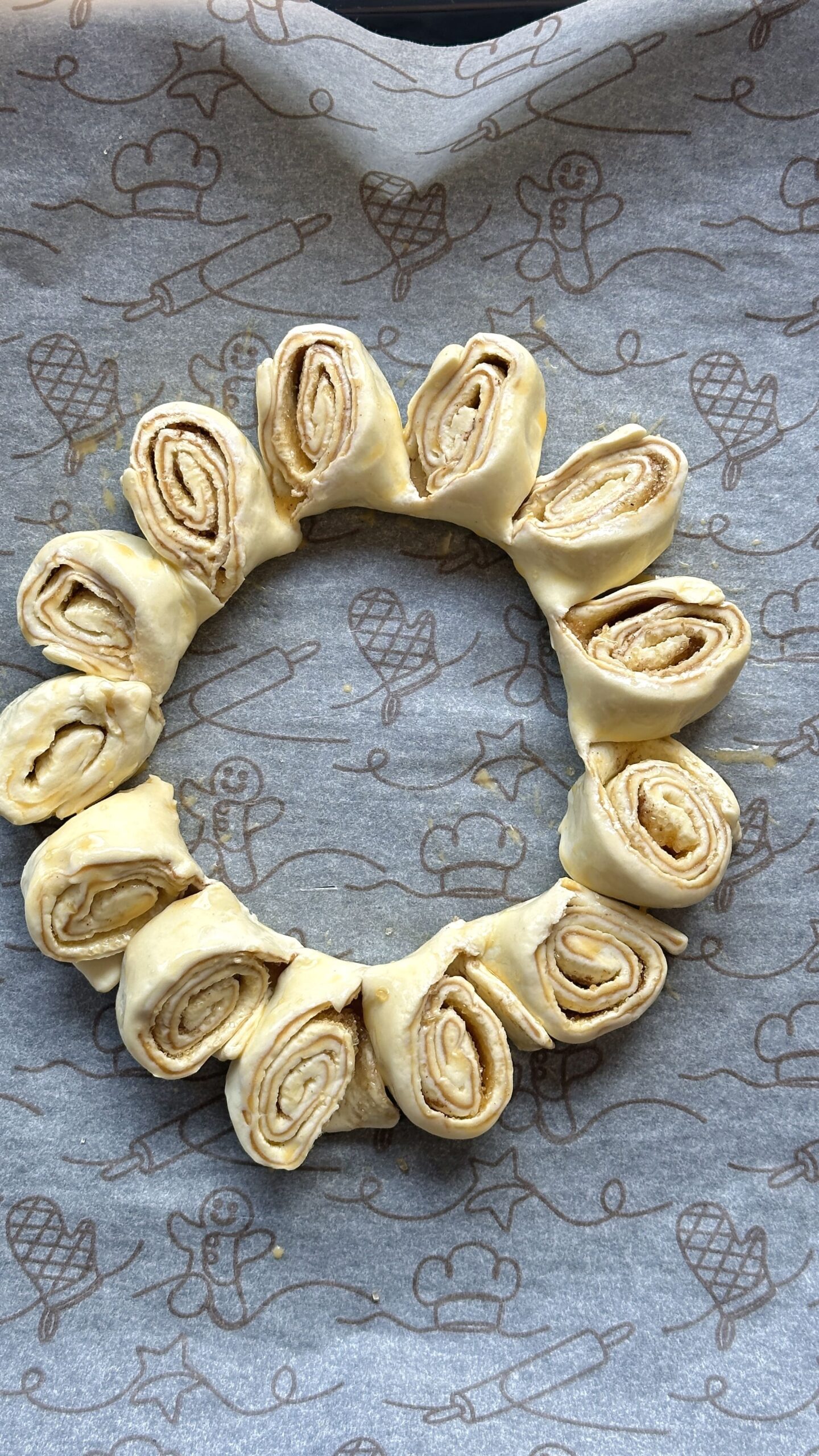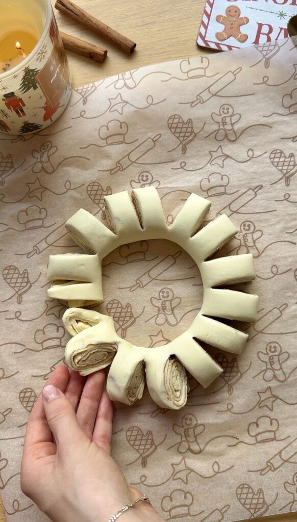Carefully bend the rolled pastry into a circular wreath shape. Arrange the small cut sections outward so the swirls of filling are visible. This is what gives your Christmas pastry wreath its festive, eye-catching look. - Egg Wash and Bake