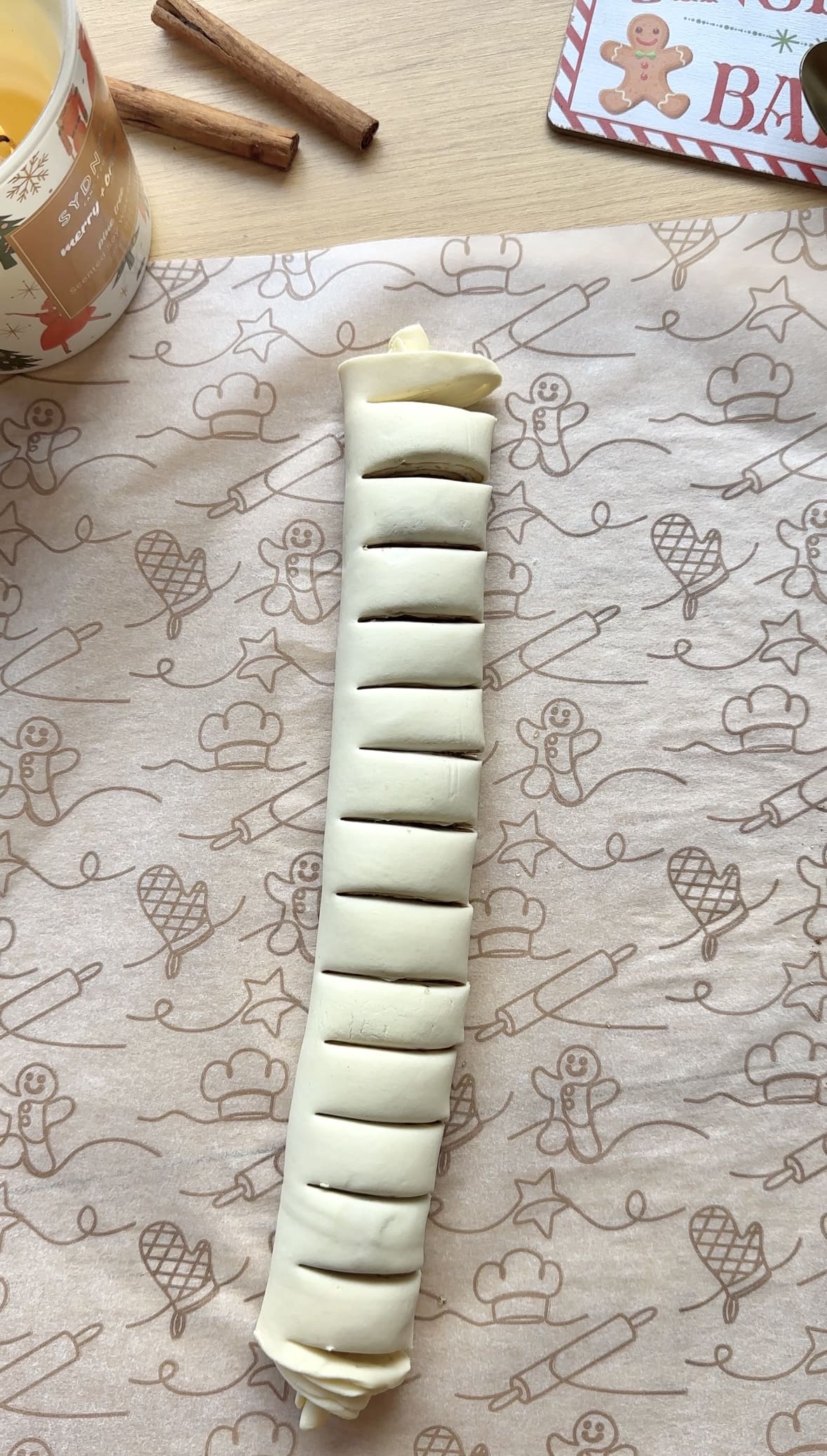 Now comes the fun part! Roll the pastry lengthwise into a tight roll. Don’t worry if it’s not perfectly even; rustic charm is part of the beauty of this wreath. - Cut Without Slicing All the Way