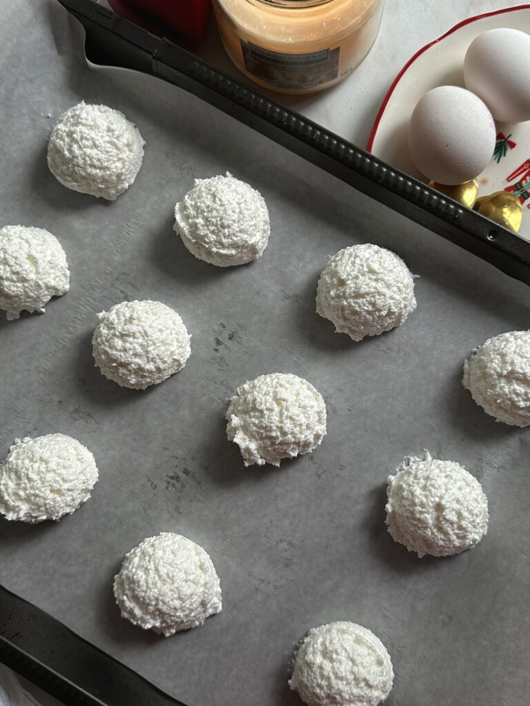 - Once your dough is ready, line a baking sheet with parchment paper. For a more rustic look, use a spoon to scoop small mounds of the mixture onto the baking sheet. If you’d like a more uniform shape, use a cookie scoop or transfer the mixture into a piping bag and pipe small mounds directly onto the parchment.