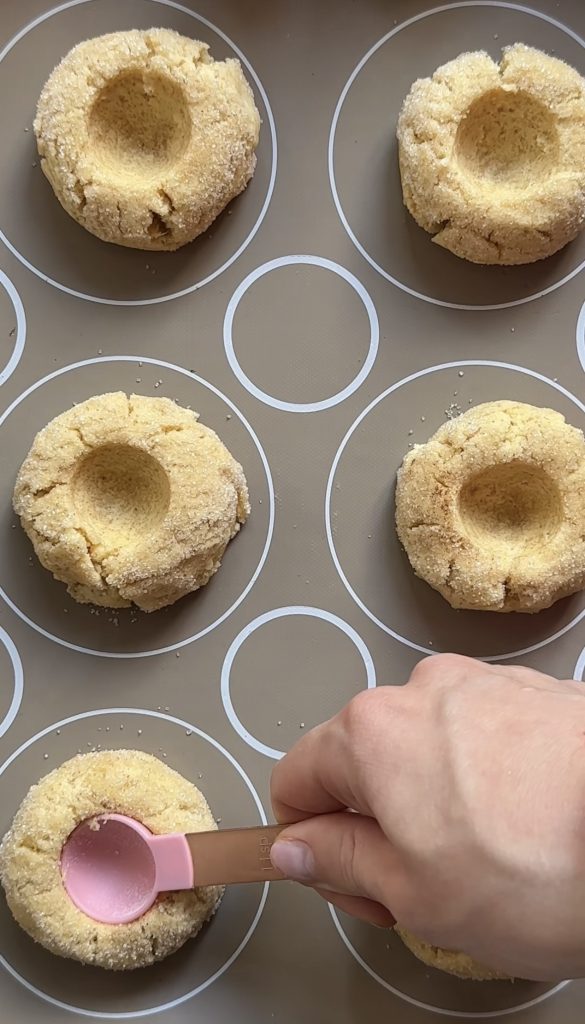 - Add the Streusel: Spoon a couple of tablespoons of the streusel mixture into the indent on each cookie.