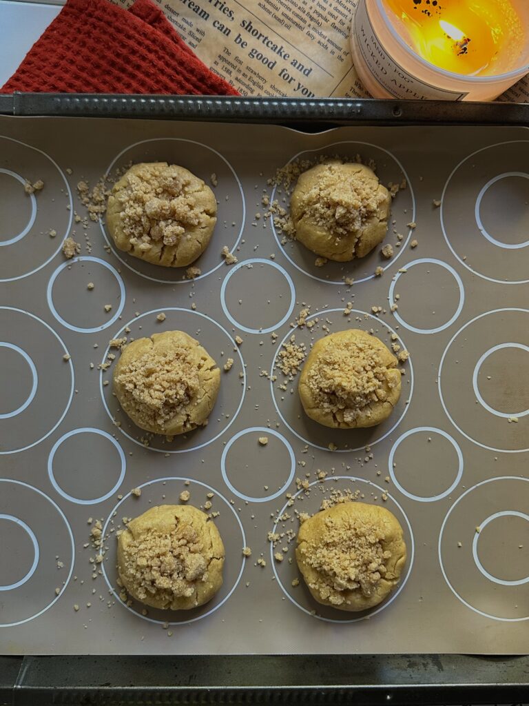 - Form the Cookies: Using a large cookie scoop, place a ball of dough on a lined baking sheet. Press the center down to create an indent for the streusel.
