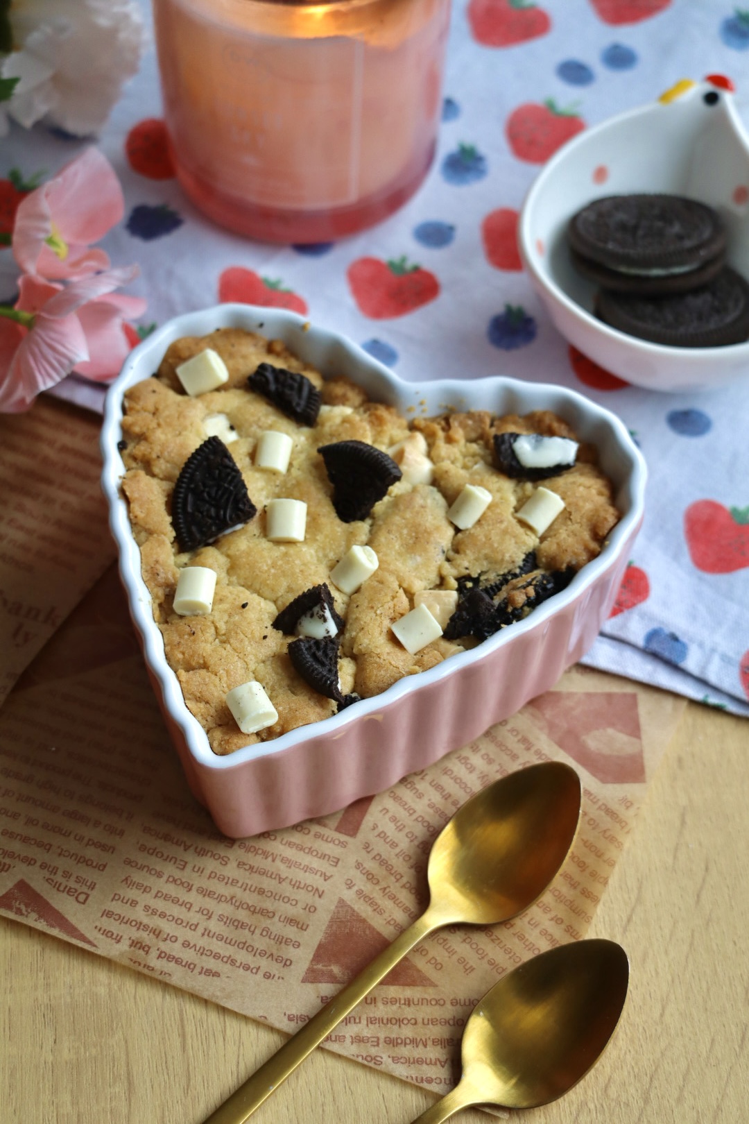 • Oven-Safe Baking Dish or Small Skillet: Used to bake the cookie as one thick piece. A small ceramic dish, a mini cast-iron skillet, or a heart-shaped baking pan all work well and help create crisp edges with a soft, fudgy center.