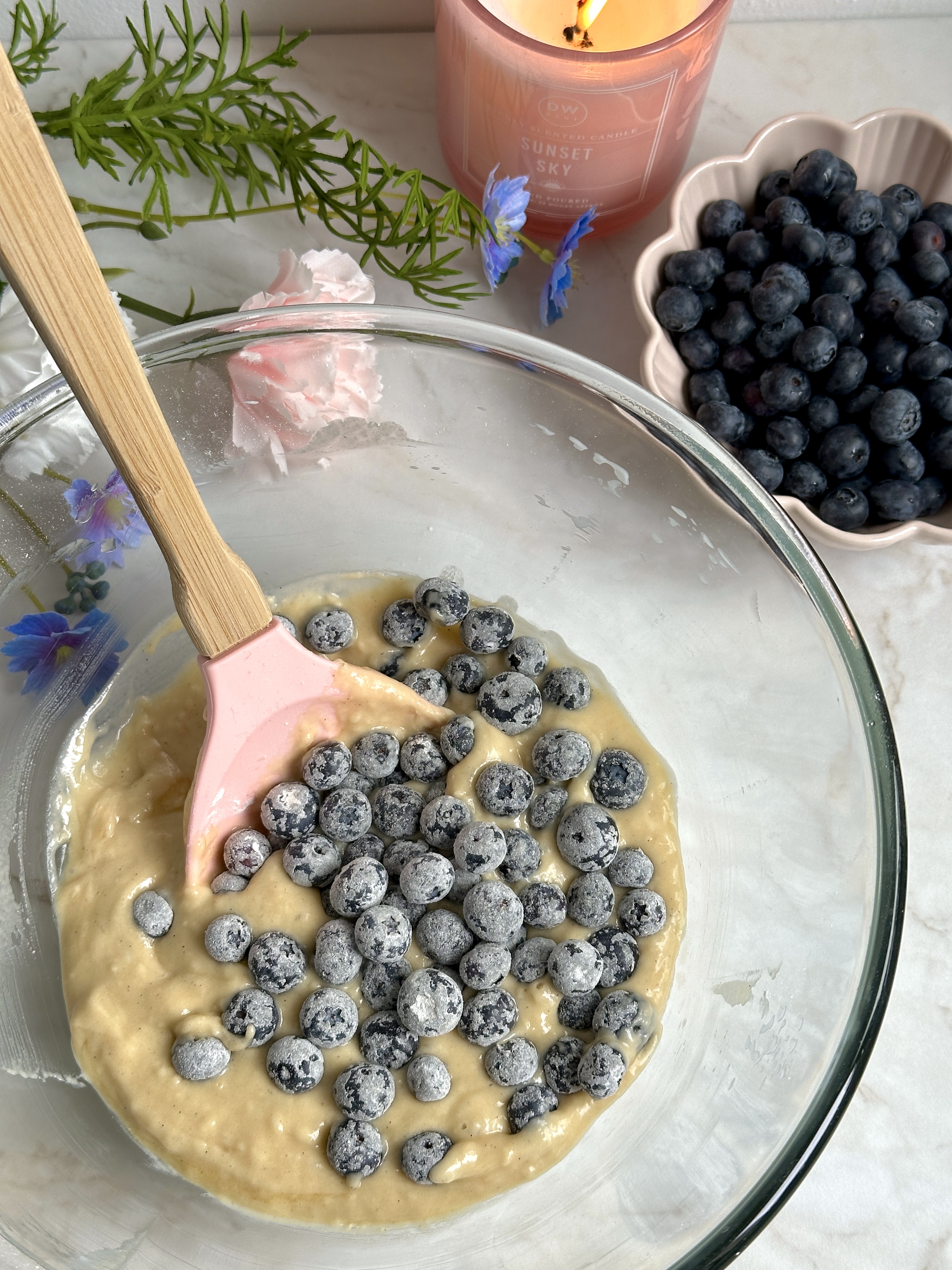 - Coat Blueberries in Flour – This keeps them evenly distributed in the batter.