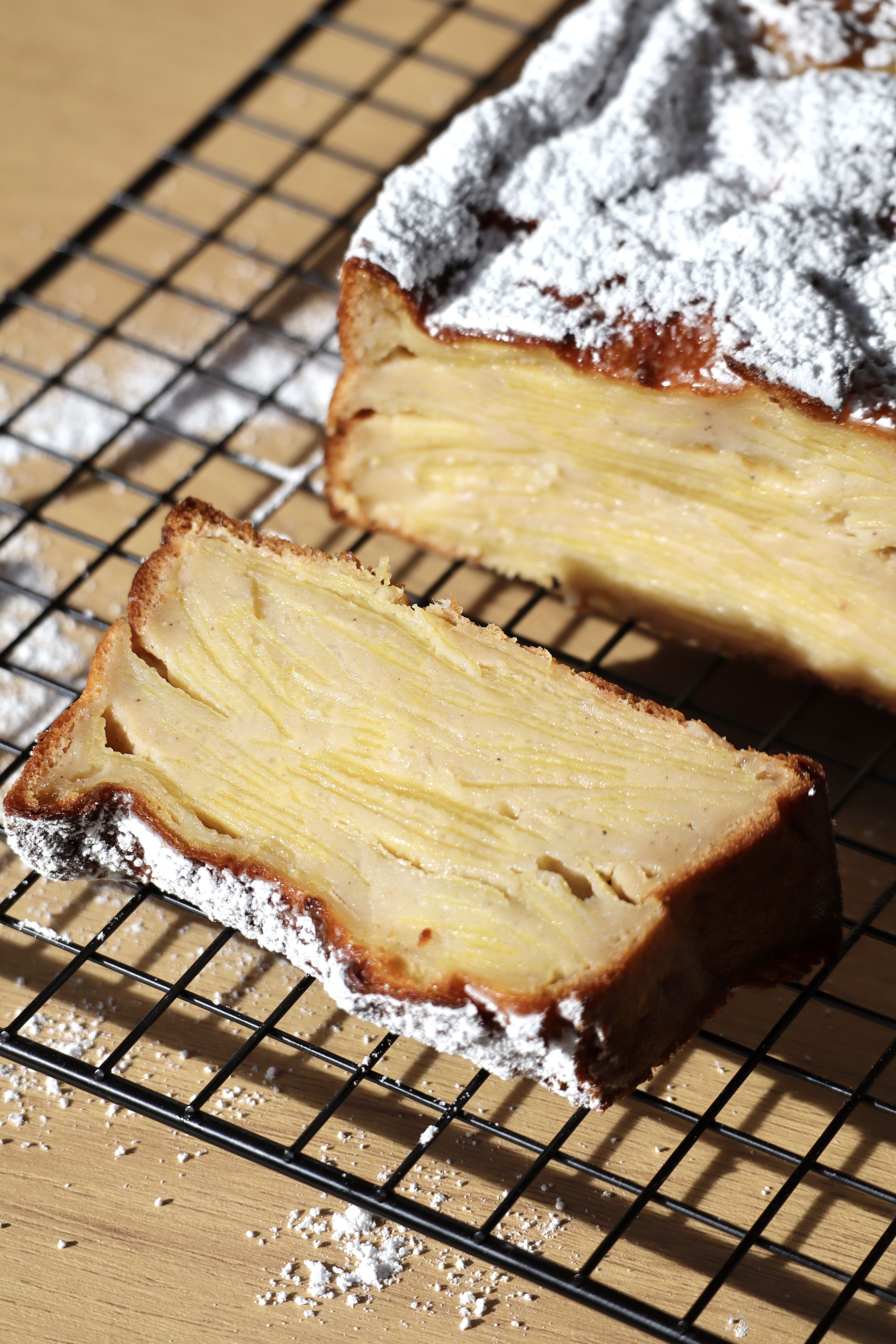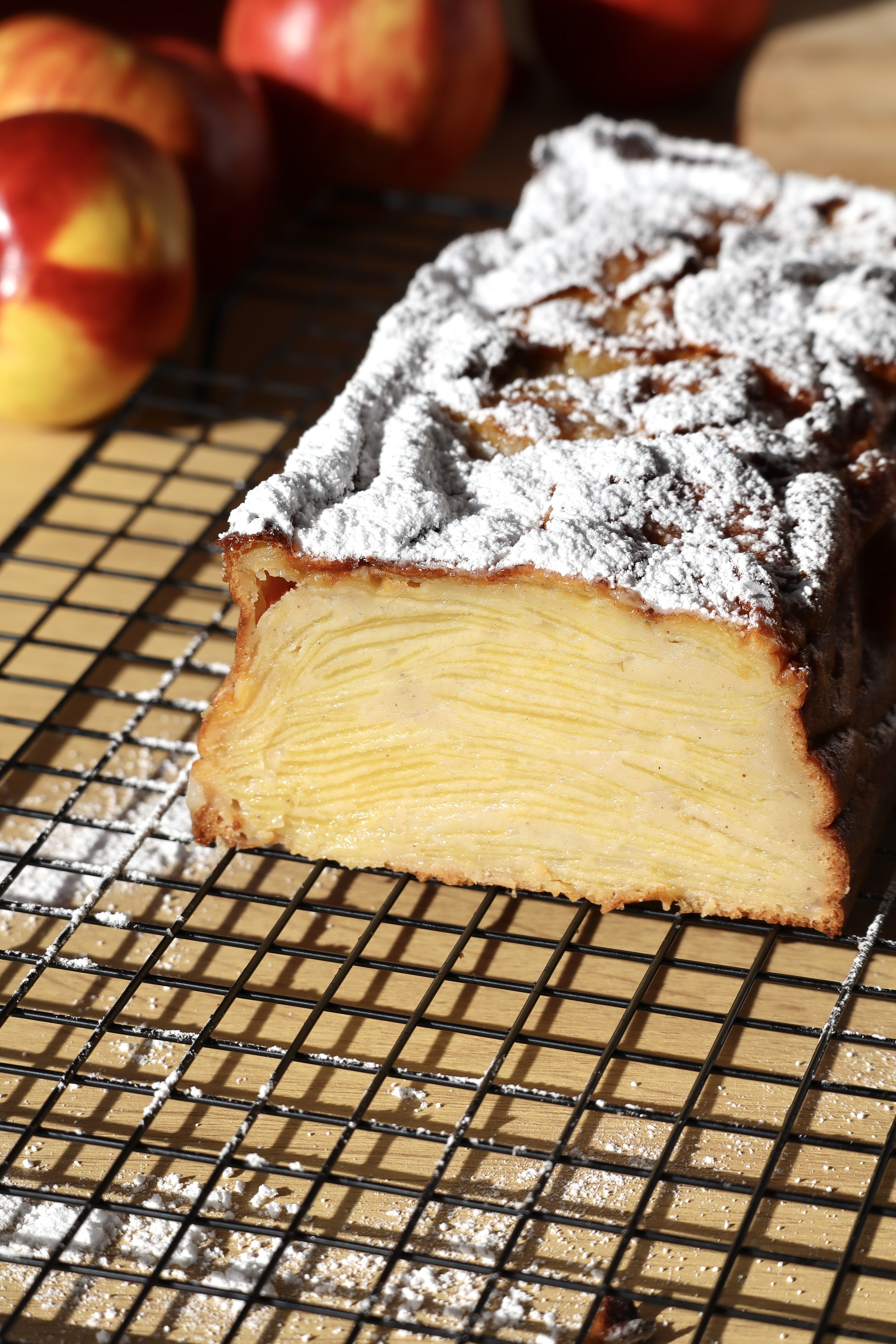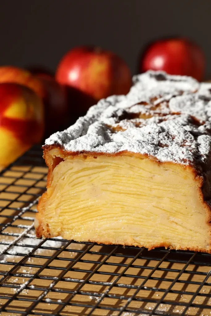 - Custard-like texture – thin layers of apple melt beautifully into the soft batter.
