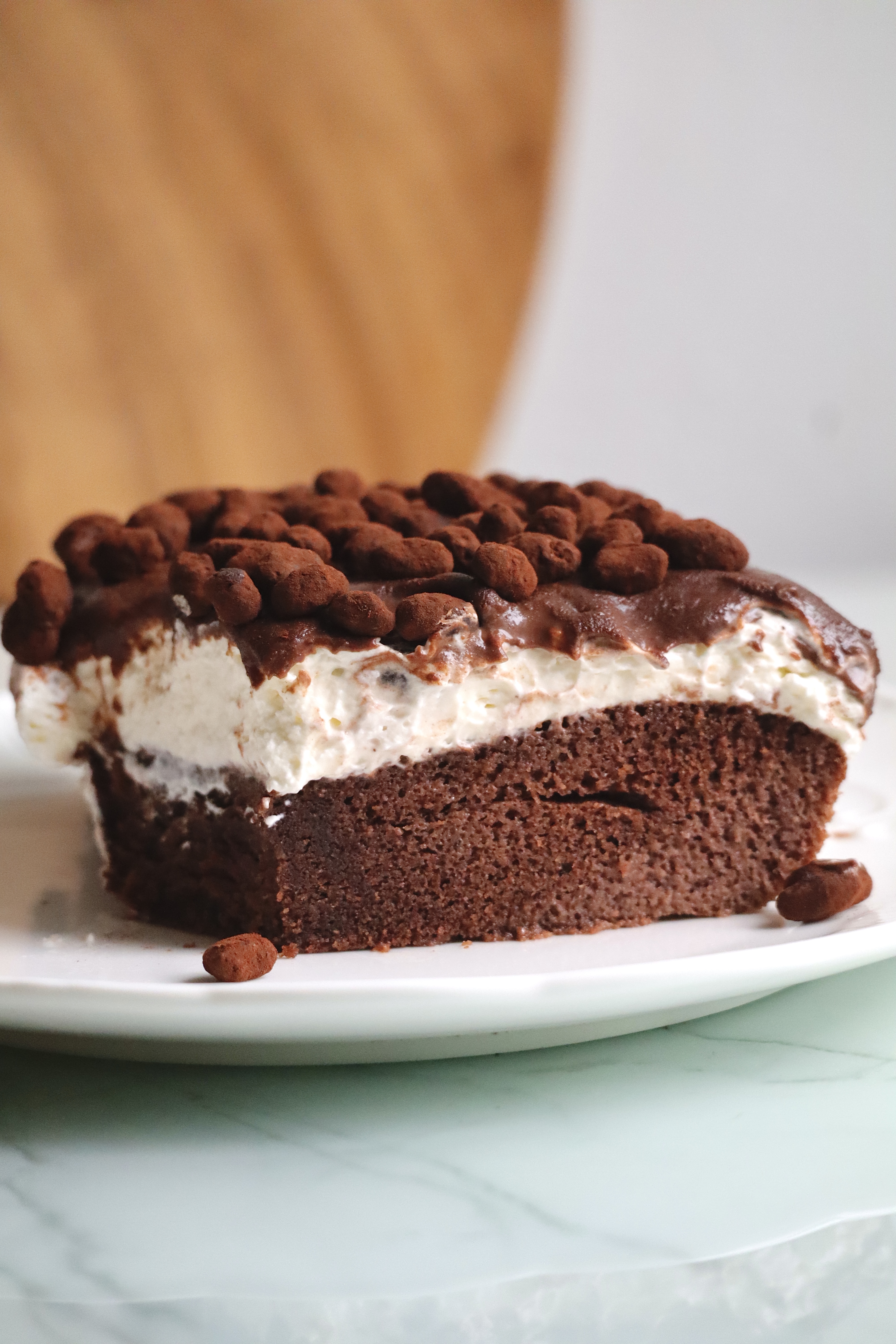 - Let it cool slightly, then pour over the cream layer and spread evenly.