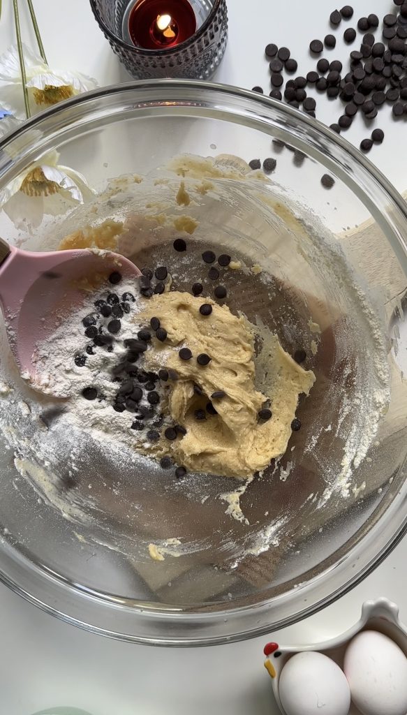 - Divide the dough into two bowls. Add the remaining 3 tablespoons of flour and half of the chocolate chips to the first bowl. Stir to combine. In the second bowl, mix in the cocoa powder and the other half of the chocolate chips.