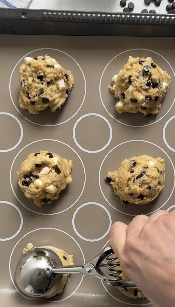 - Bake the Cookies: Preheat your oven to 175°C (350°F) and line a baking sheet with parchment paper. Scoop the dough into 10 equal portions and place them on the prepared baking sheet. Bake for about 10 minutes, until the edges are slightly crispy but the centers still look a bit raw. Trust me, they will continue to bake while cooling.