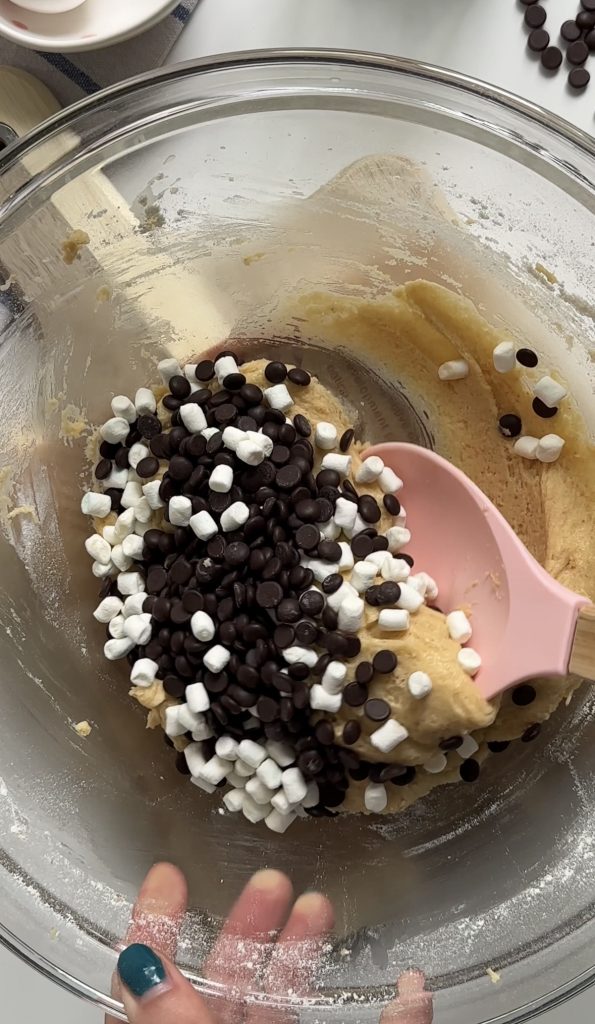 - Fold in the Goodies: Gently fold in the chocolate chips and mini marshmallows until evenly distributed throughout the dough.