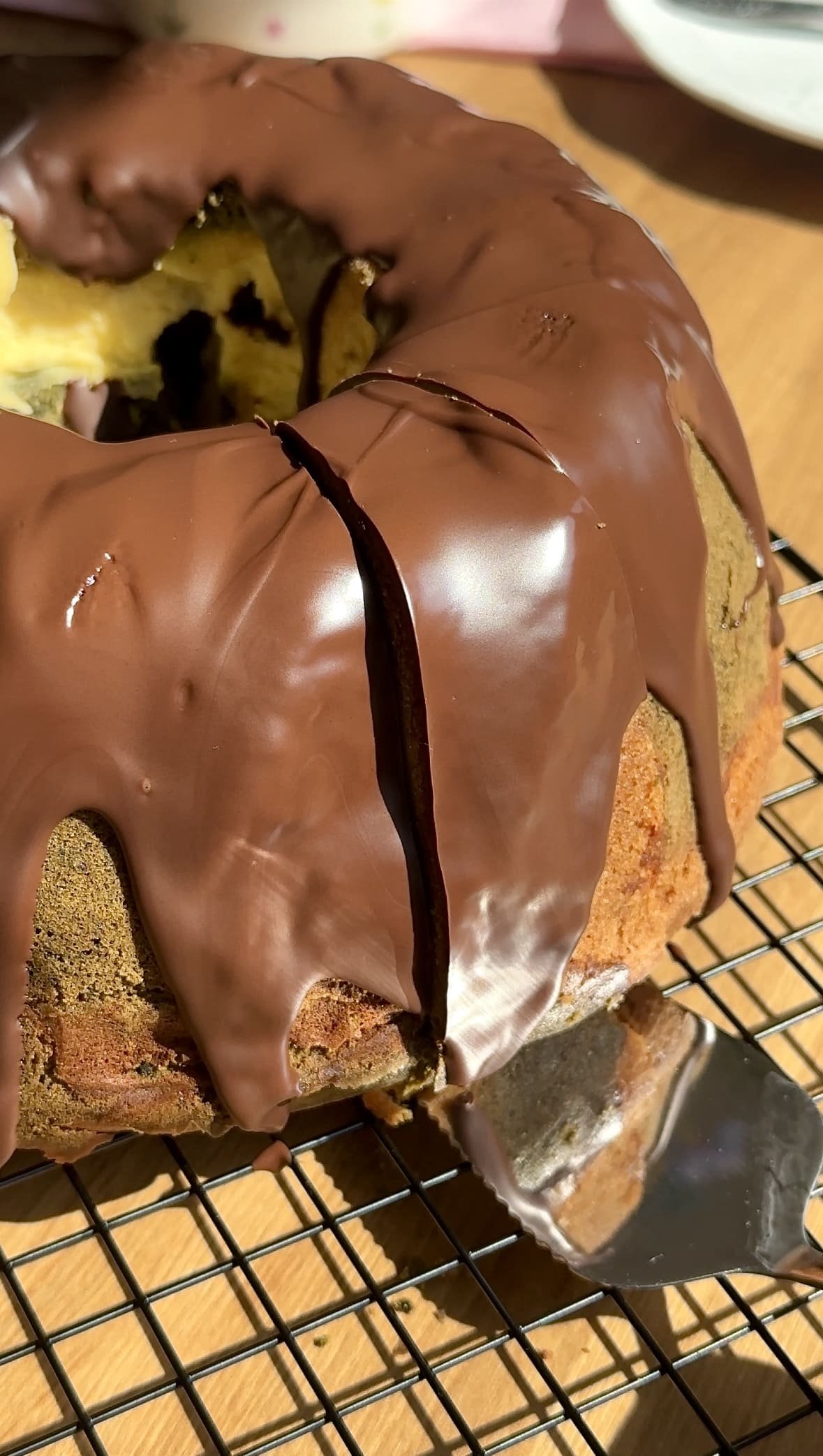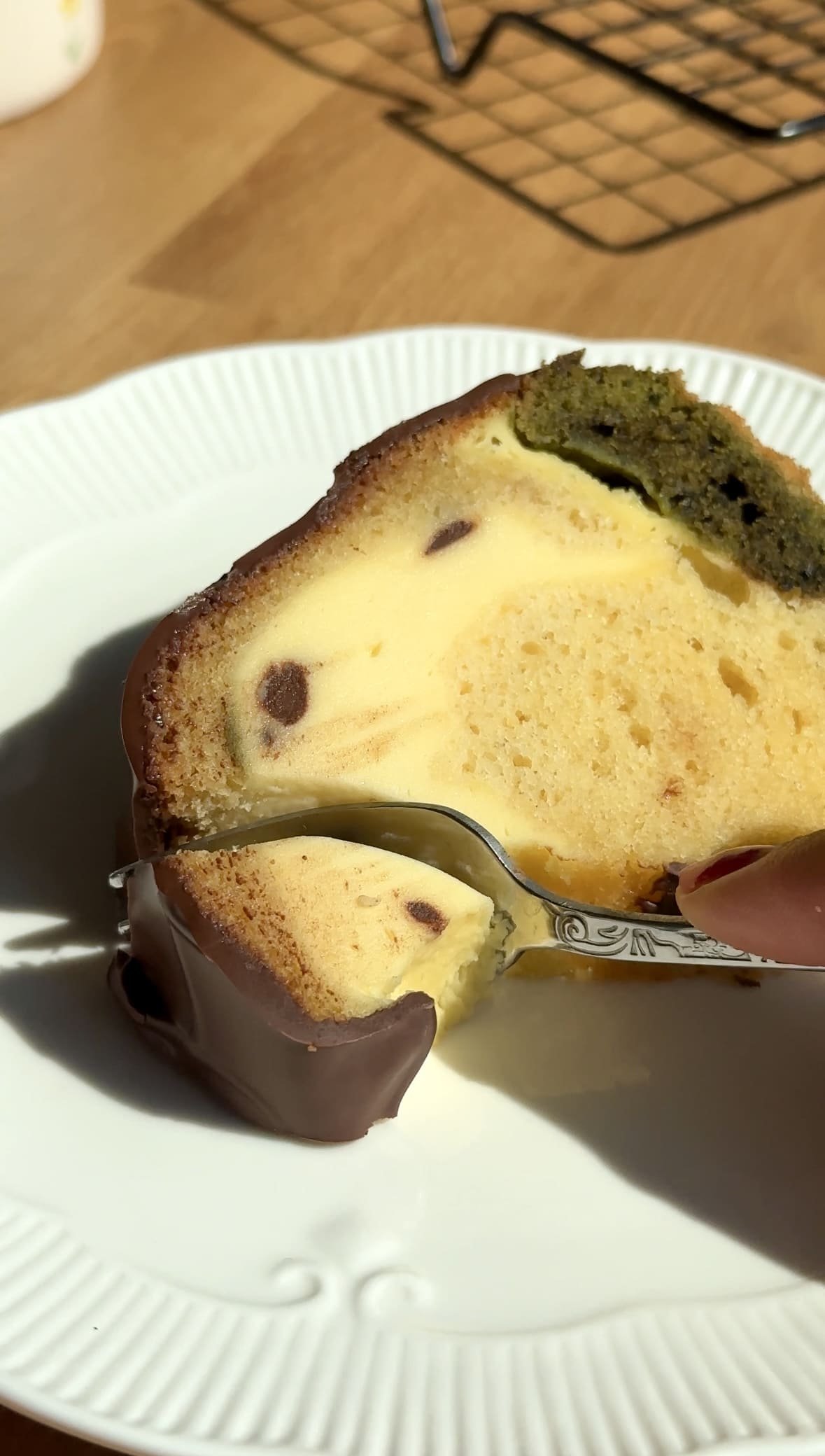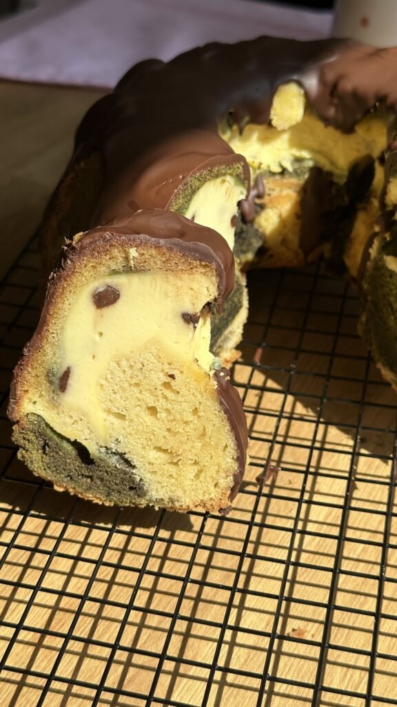 Finished with chocolate chips and a glossy dark chocolate glaze, this cake is indulgent yet perfectly balanced. The earthy notes of matcha pair beautifully with the sweetness of the batter and the tangy creaminess of the cheesecake filling.