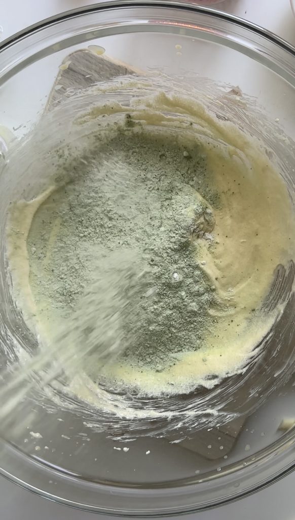 - Mix dry ingredients: In a small bowl, whisk together all-purpose flour, matcha powder, baking powder, baking soda, and salt. Set this mixture aside.