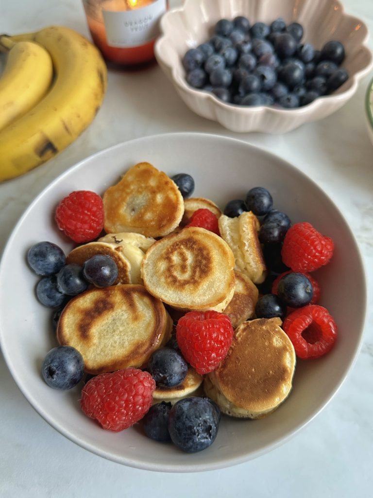 - Transfer the mini banana pancakes to a serving plate. Top with fresh berries and drizzle with maple syrup if desired. Serve warm and enjoy!