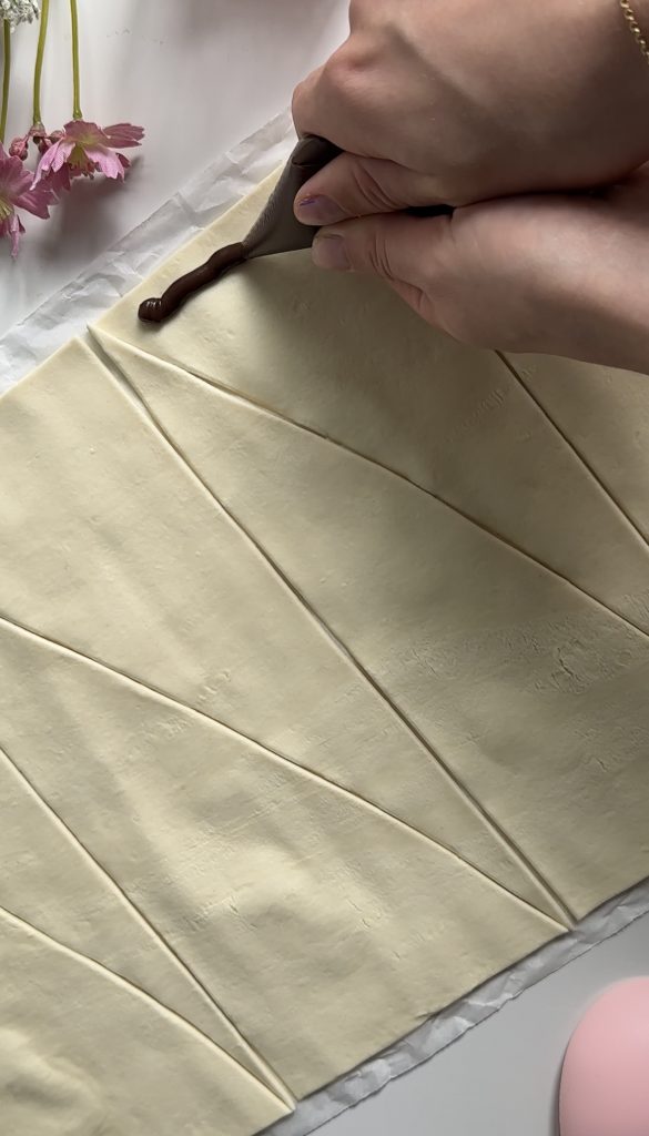 - Spread a generous amount of chocolate cream on the wide end of each triangle. This will be the delicious filling inside each croissant.