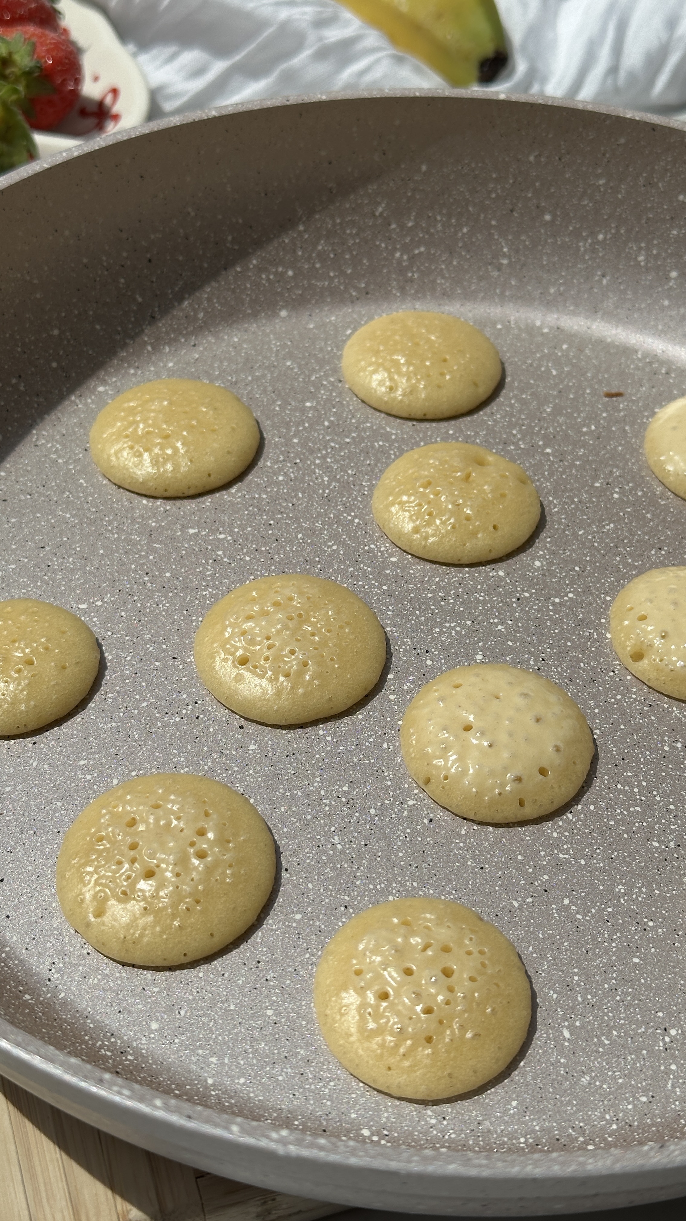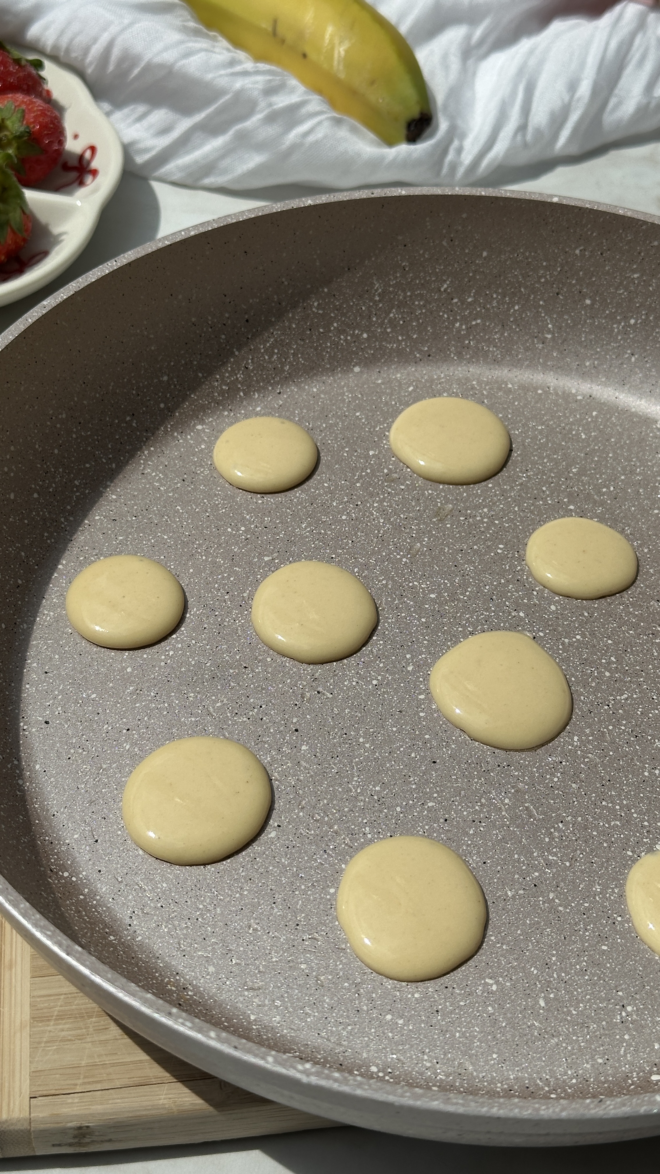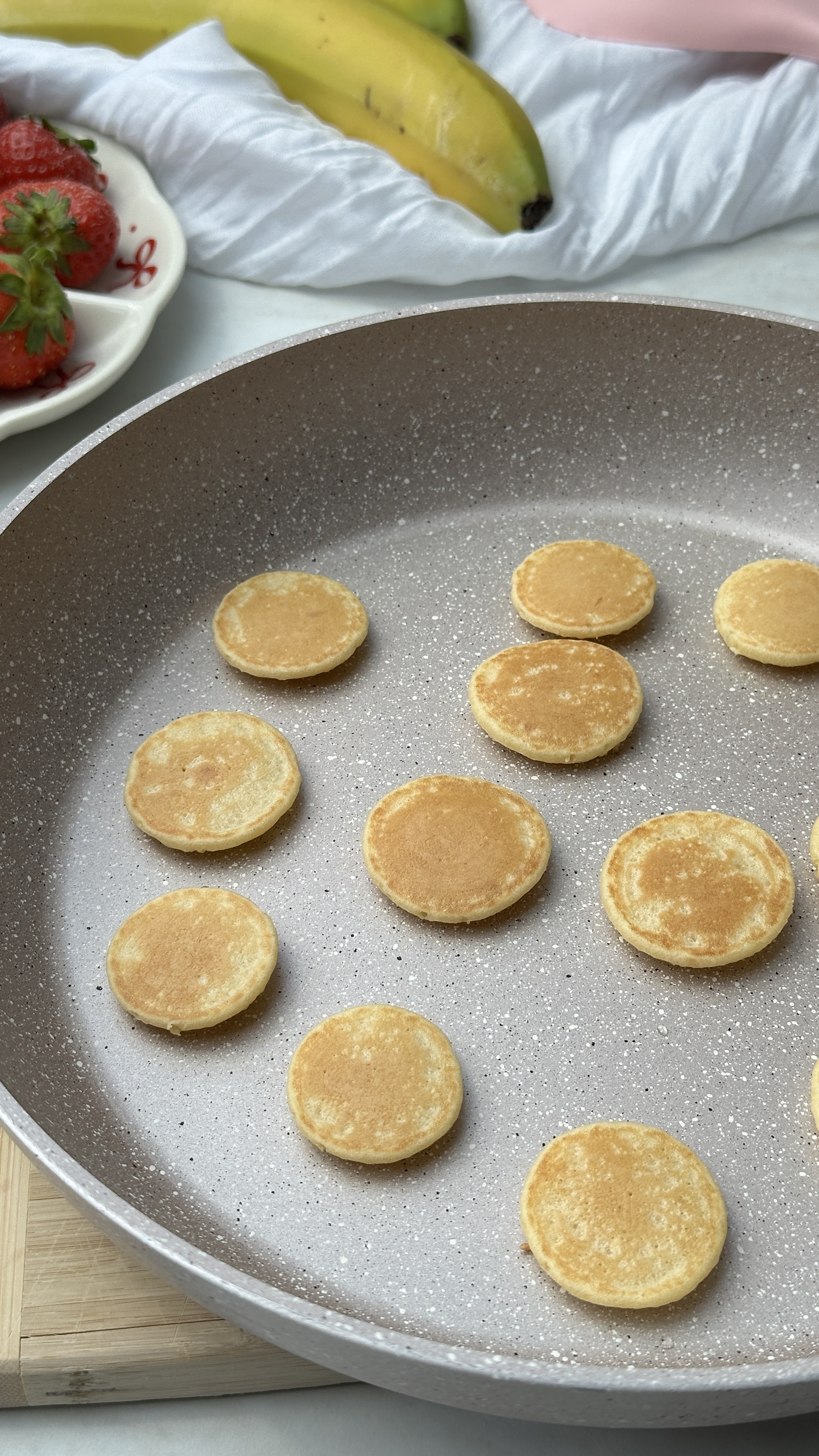 Heat a non-stick pan on medium. Add small scoops (1 tbsp) of batter for mini pancakes. Cook until bubbles form and flip. Cook the other side until golden. Repeat.