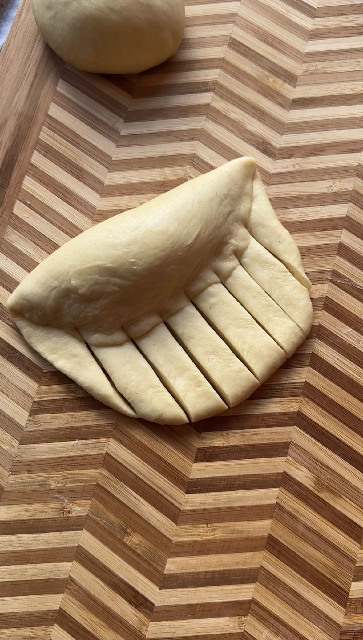 Take one dough ball and roll it out into an oval shape — slightly longer than wide.