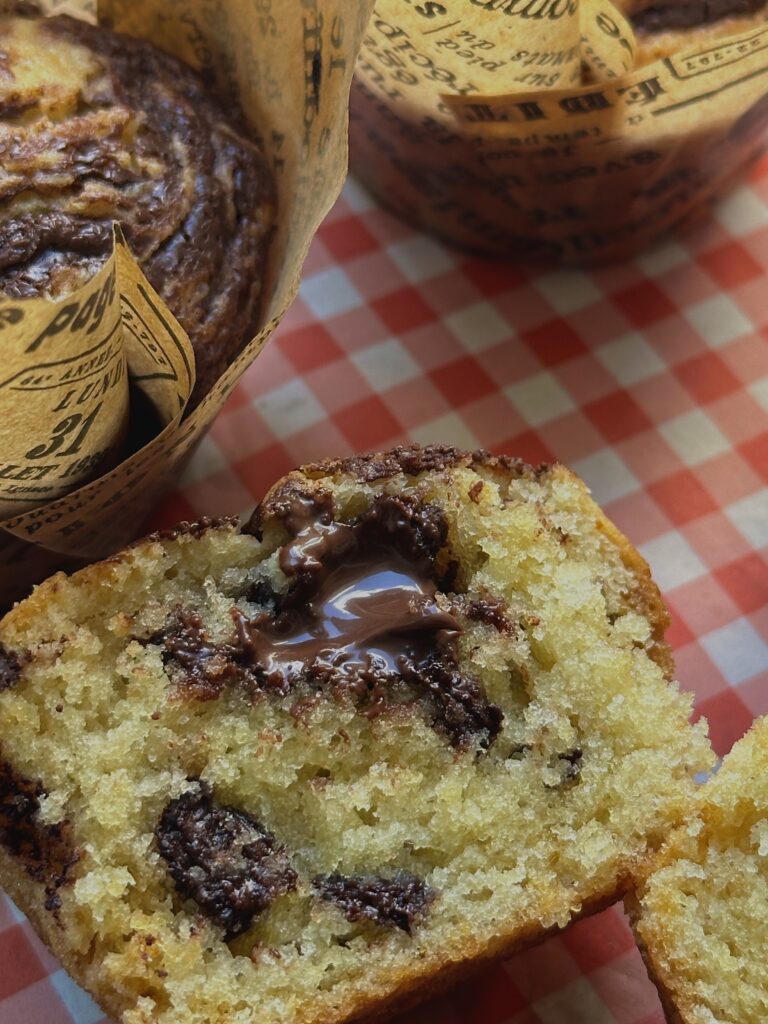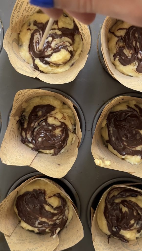 - Add Nutella Swirl: Warm the remaining Nutella slightly, drizzle it over the muffin tops, and swirl with a butter knife.