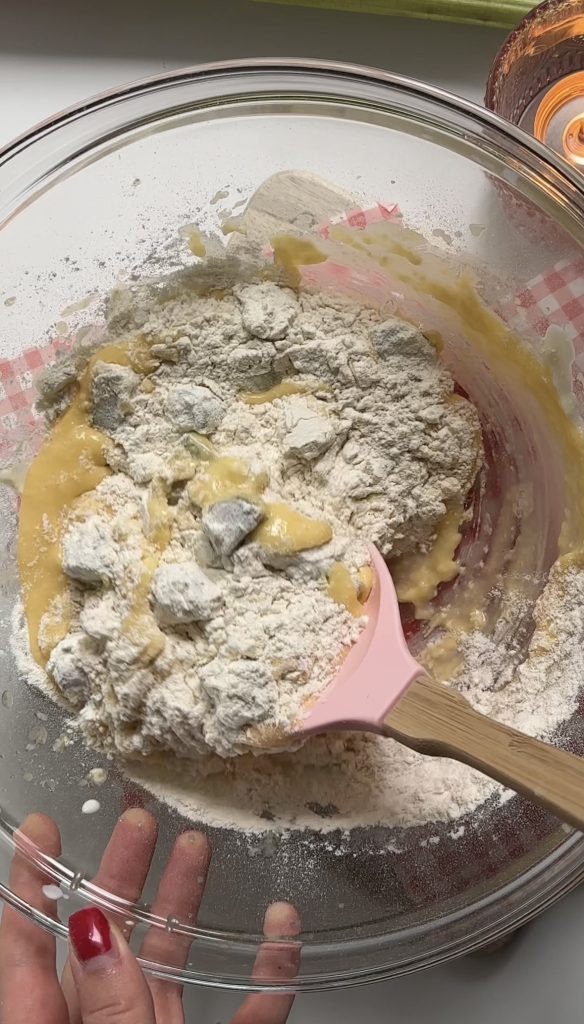 - Combine Ingredients: Stir the rhubarb into the batter along with the flour mixture.