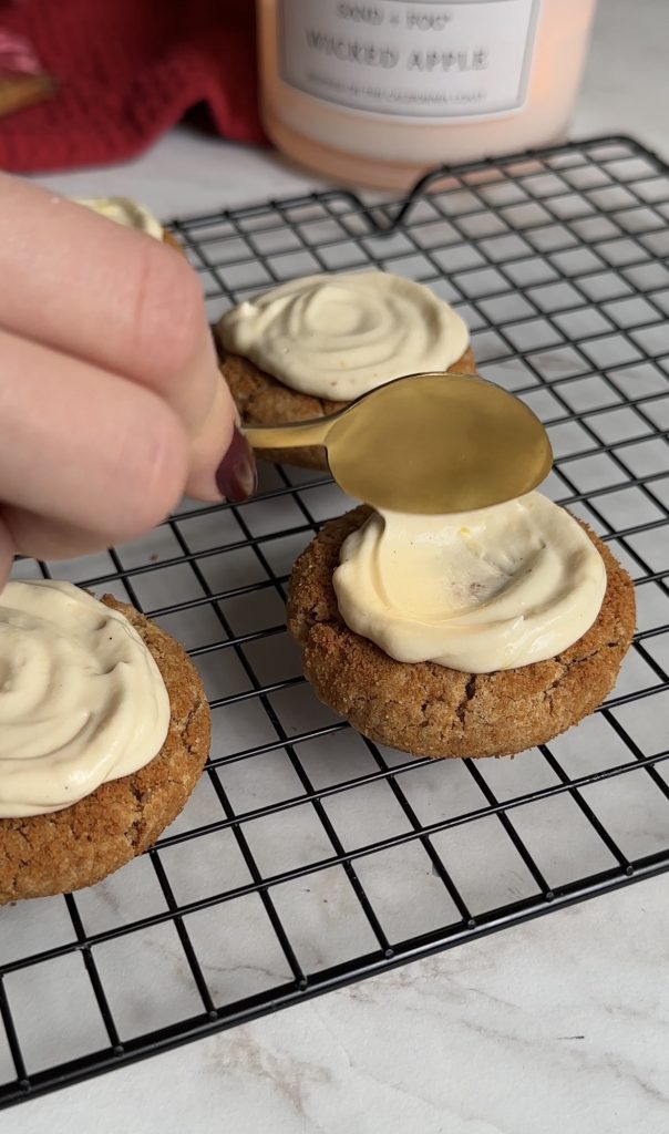 1. Frost the Cookies: Once the cookies are completely cool, pipe a generous swirl of cream cheese frosting onto each cookie.