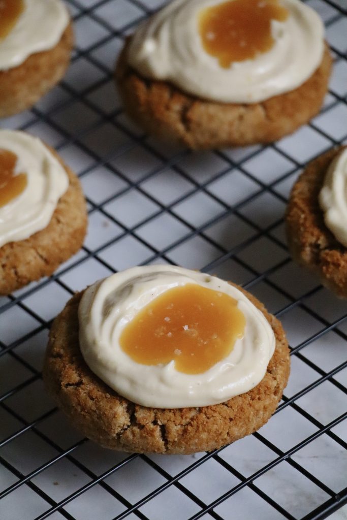 1. Frost the Cookies: Once the cookies are completely cool, pipe a generous swirl of cream cheese frosting onto each cookie.