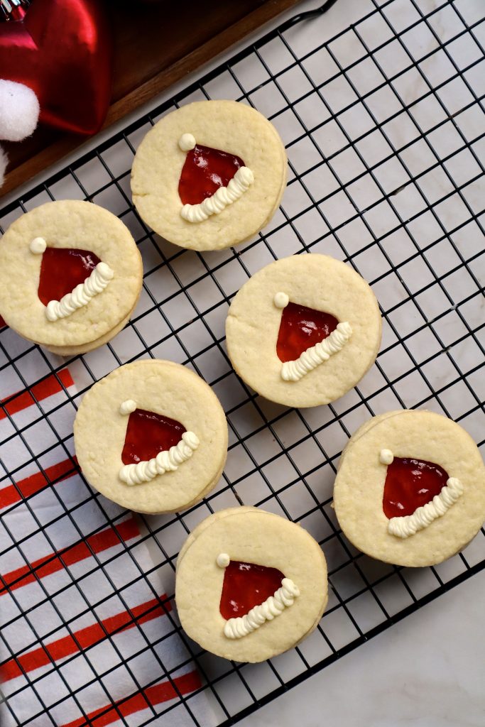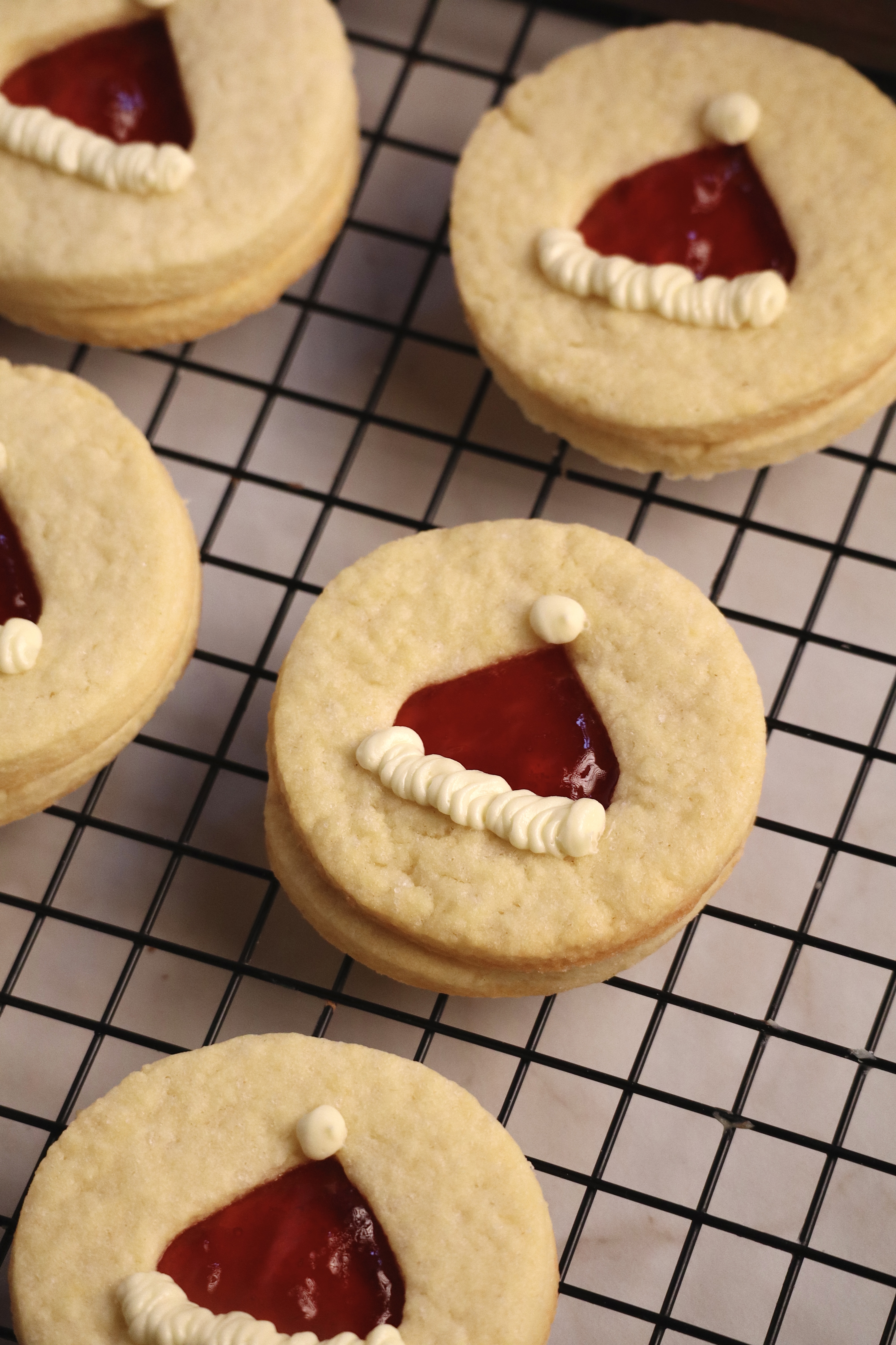 - Sandwich the Cookies: Gently place the Santa hat-shaped cookies on top, aligning them with the round base cookies. Press lightly to secure them together with the jelly.