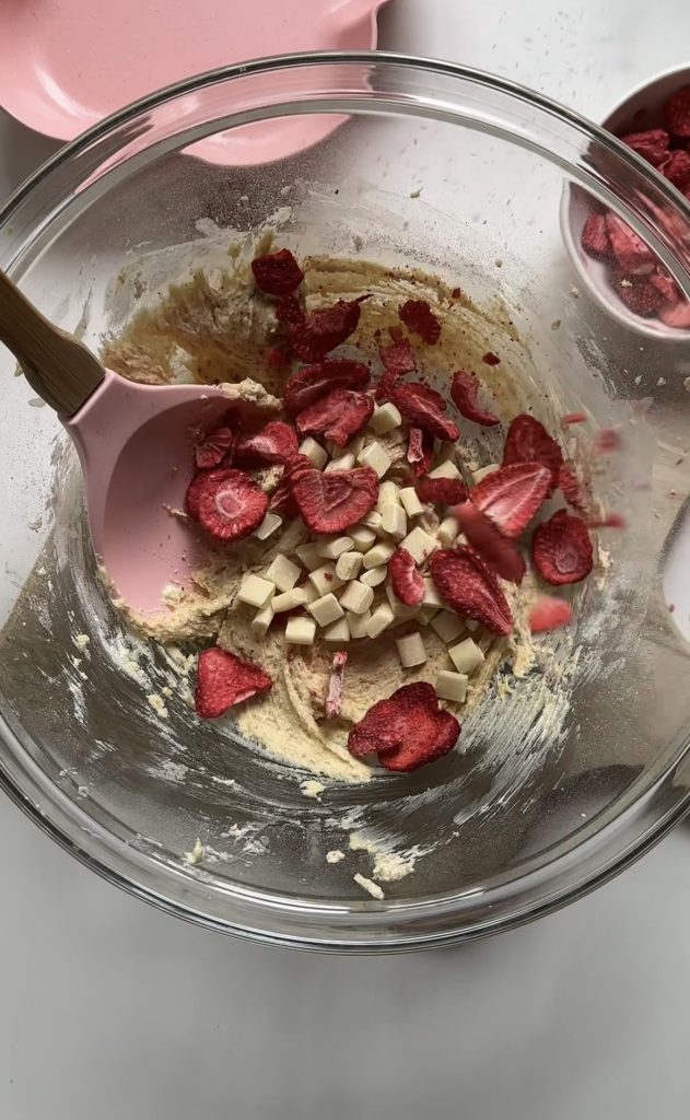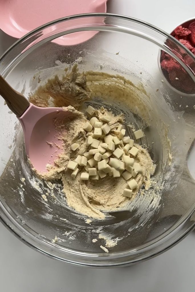 - Fold in Mix-Ins: Gently fold in the freeze-dried strawberries and white chocolate chips until evenly distributed throughout the dough.