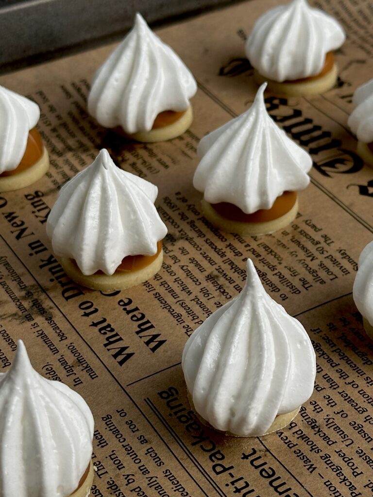 - Pipe the meringue onto the cookies, starting from the base of the candy and swirling upward to fully cover the candy in a dome shape.