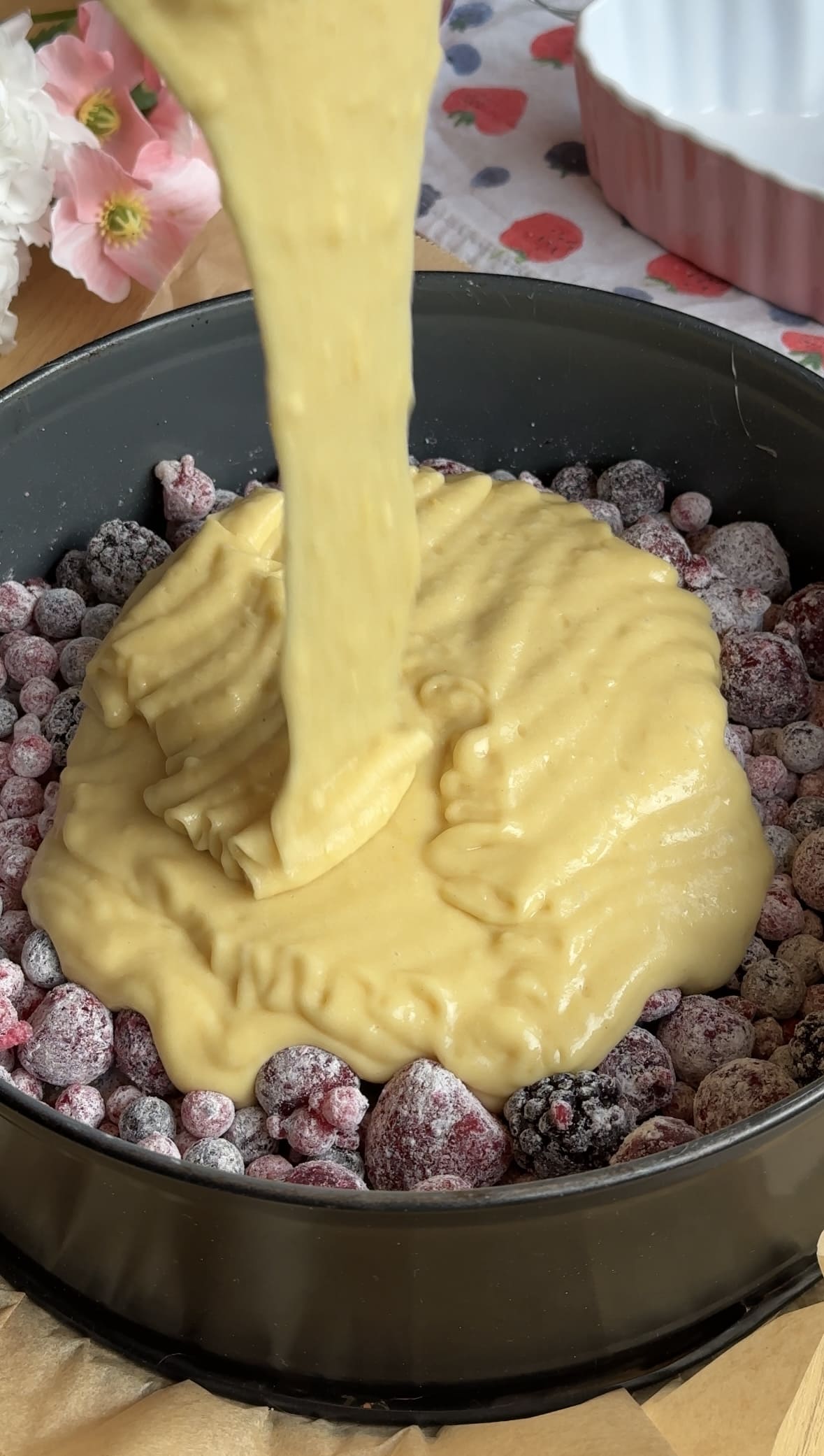 Carefully pour the batter over the berries, making sure it fully covers them. Smooth the top gently. - Bake