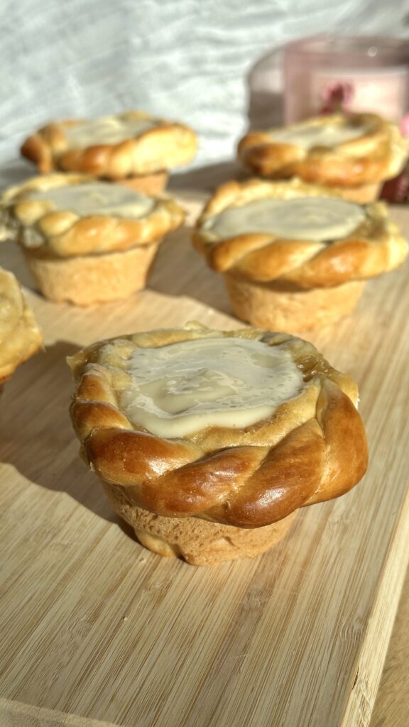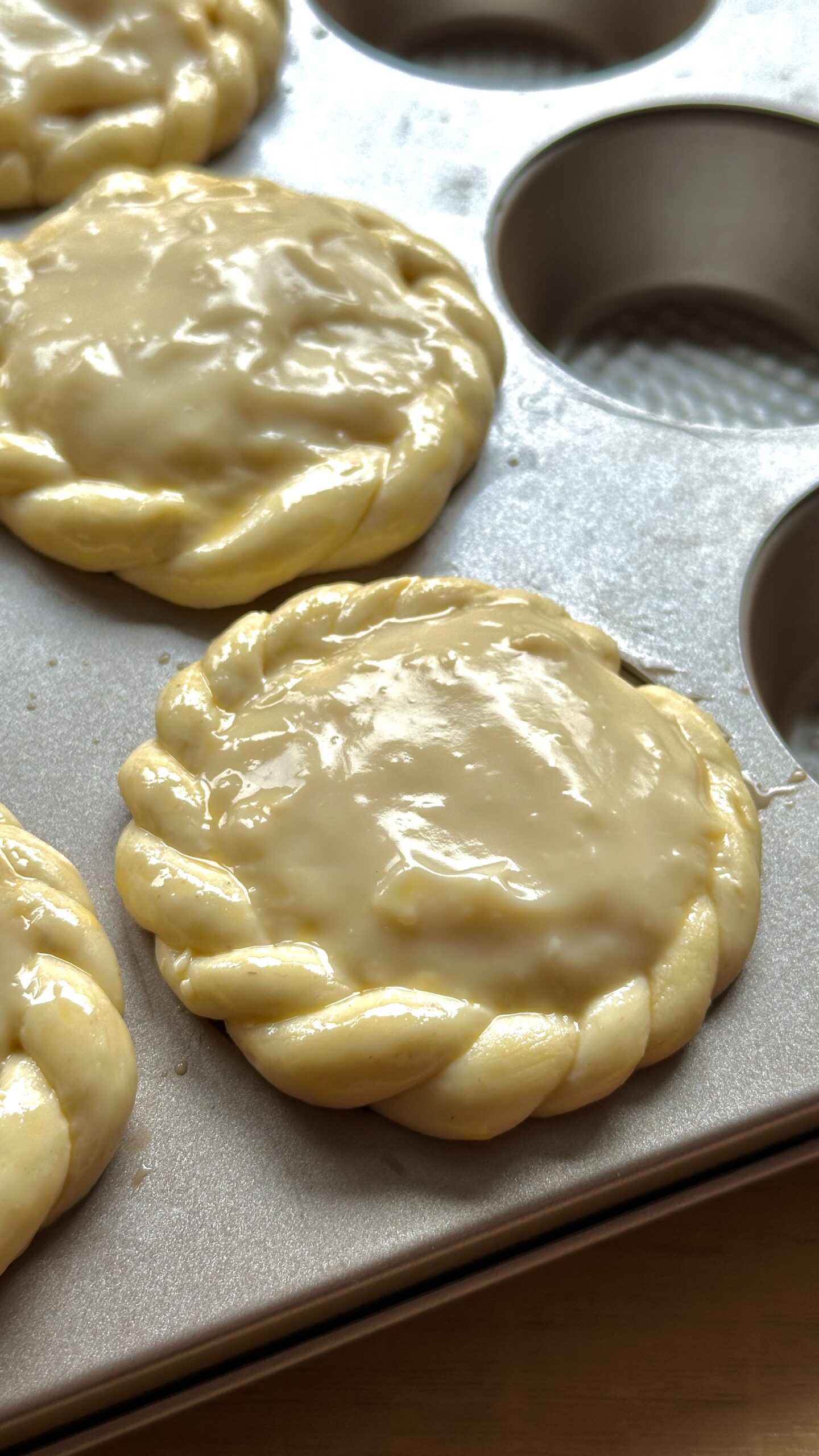 • Custard that holds its shape: The vanilla custard is cooked thick and slightly reinforced with starch, so it sets at the same pace as the dough and stays neatly in the center.
