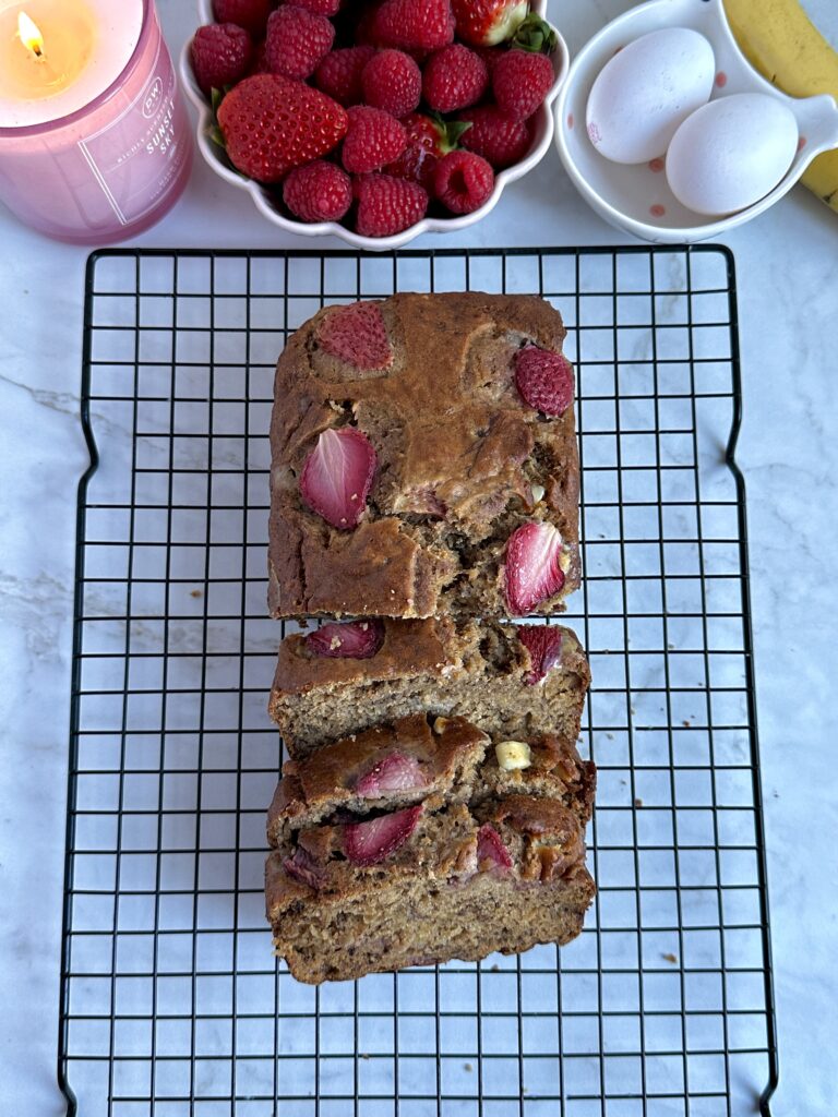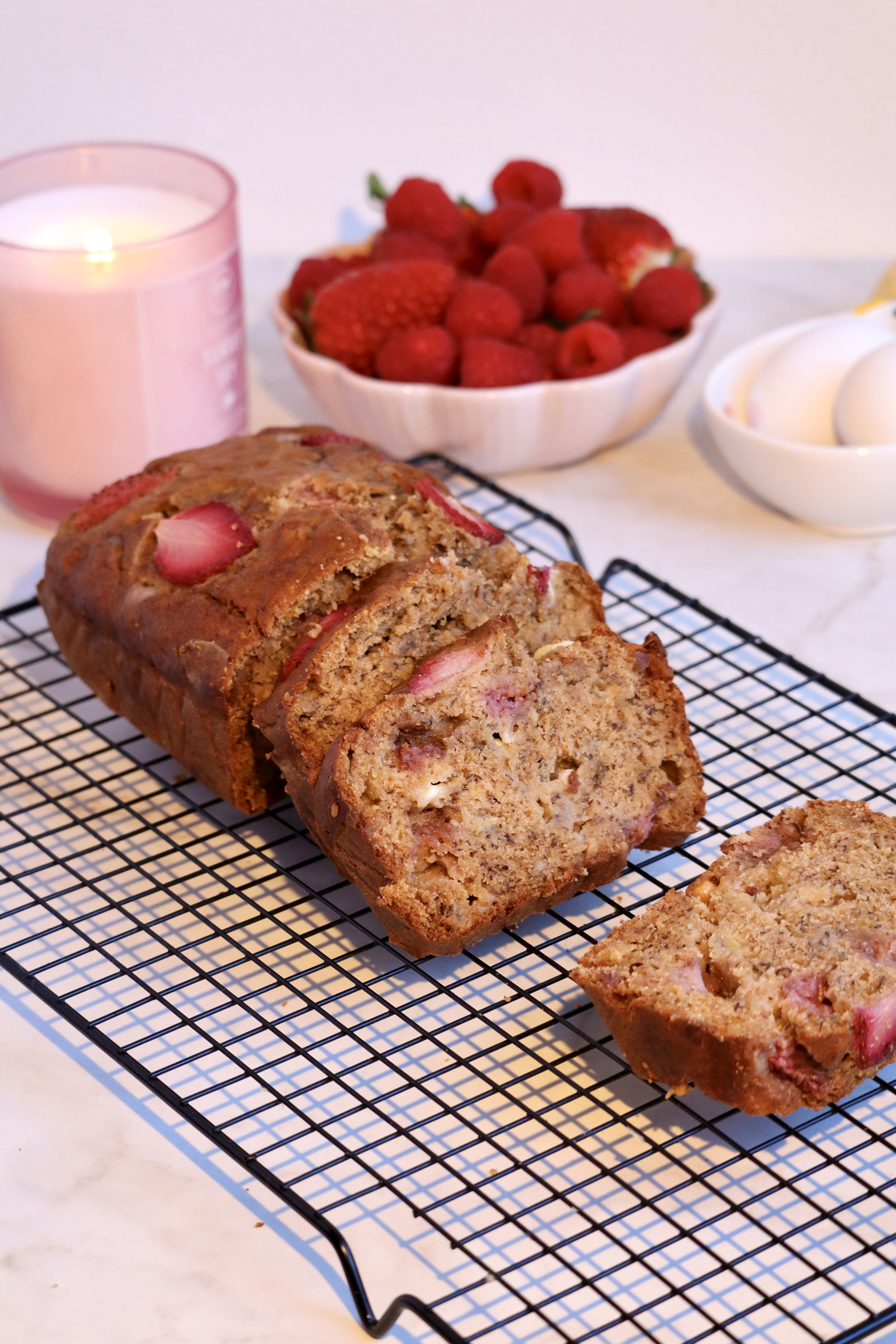 The creamy sweetness of white chocolate pairs beautifully with the tart juiciness of strawberries. Combined with the natural richness of bananas, this bread offers a perfect balance of flavors. The spelt flour and coconut sugar add a subtle nuttiness and caramel-like depth, making each bite irresistibly delicious.